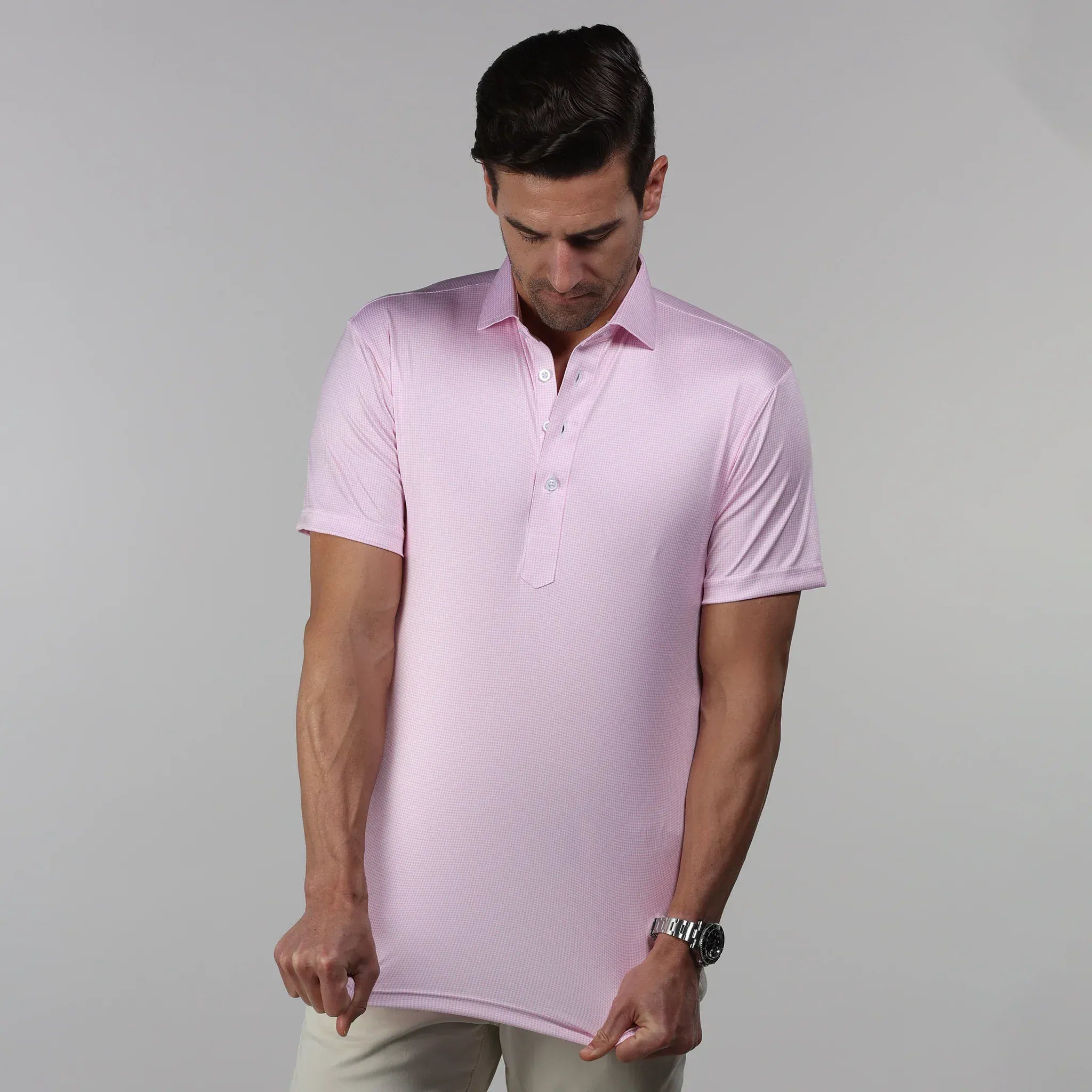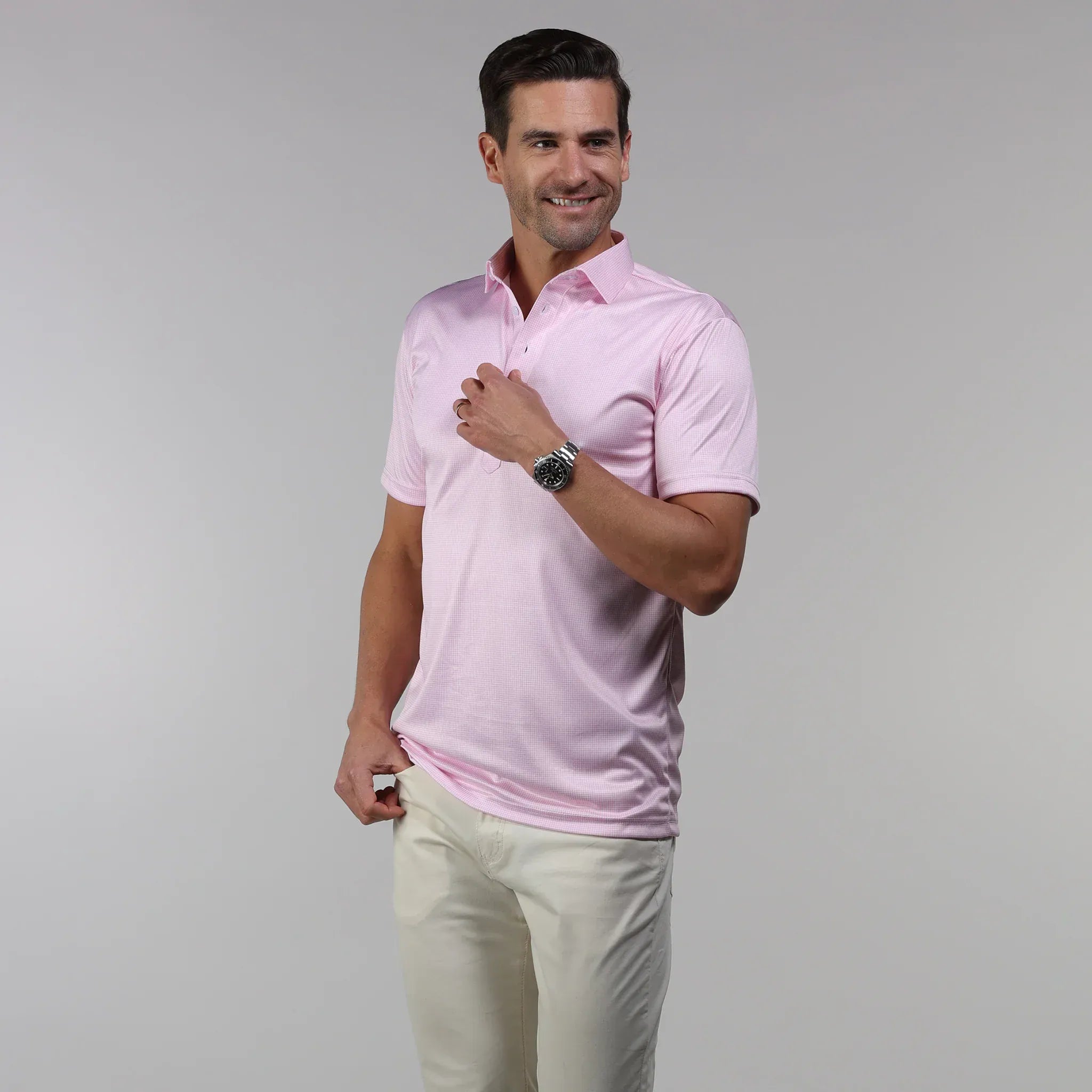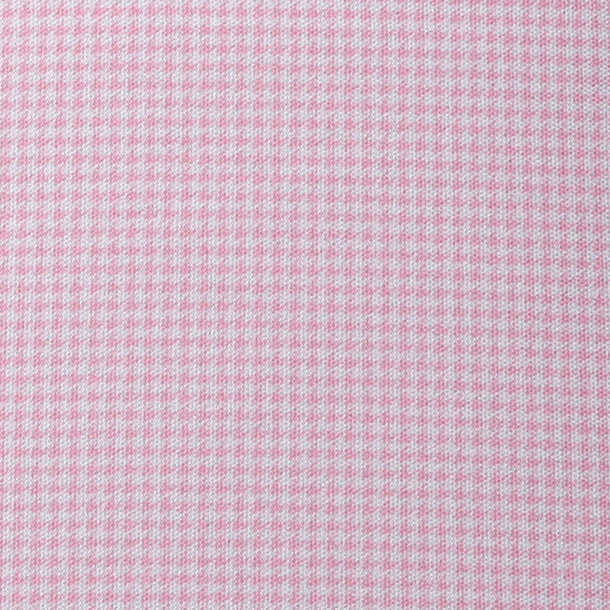 Elevate your casual wardrobe with this pink houndstooth polo that seamlessly blends sophistication and comfort. Featuring a refined semi-spread collar that works beautifully with various tie styles, this short-sleeved piece offers the polished look of a dress shirt with the ease of a polo. The 4-way stretch fabric moves with you throughout your day, making it perfect for both professional settings and weekend outings. A modern essential that proves you don't have to choose between style and comfort.