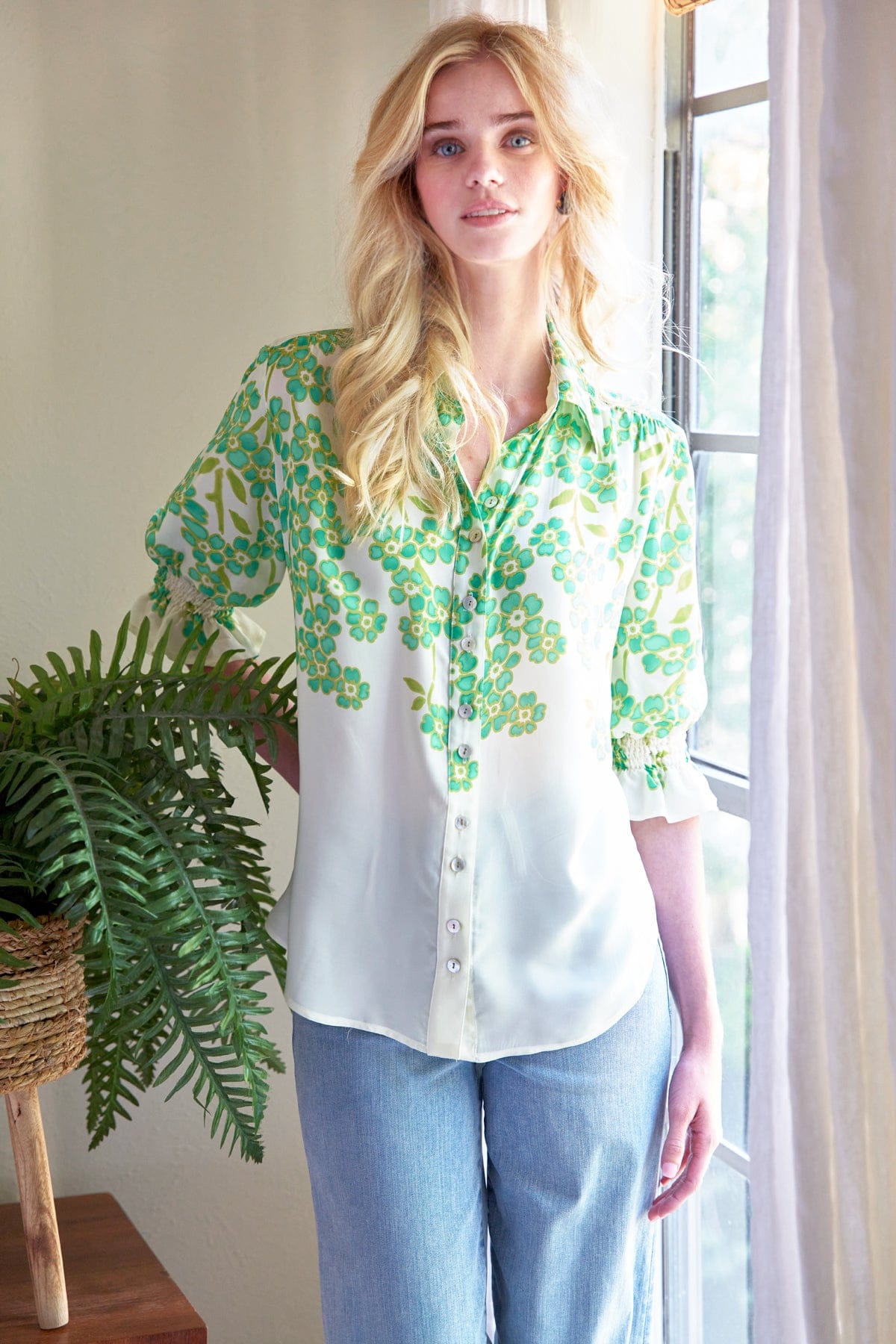 The Finley Sirena Shirt features refined tailoring details that elevate everyday wear. Button-front closure pairs with elbow-length puffed sleeves finished with smocked cuffs for a polished, intentional silhouette. Subtle shirring along the shoulder seam adds dimensional texture and ensures a graceful fit through the upper body. An essential piece that transitions seamlessly from office to weekend occasions.