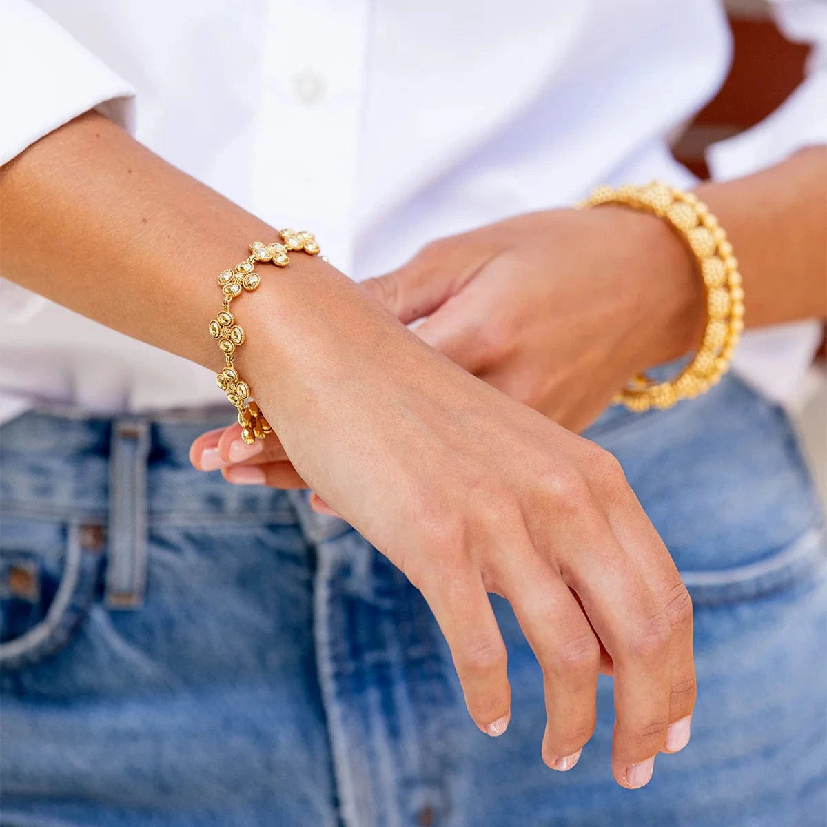Better than finding a lucky clover, this stunning bracelet is like stumbling upon a field full of them, with gleaming golden clovers united in linear fashion. This go-to piece layers beautifully in a bracelet stack, is fabulously versatile, and elevates your ensemble with a splash of serendipity.