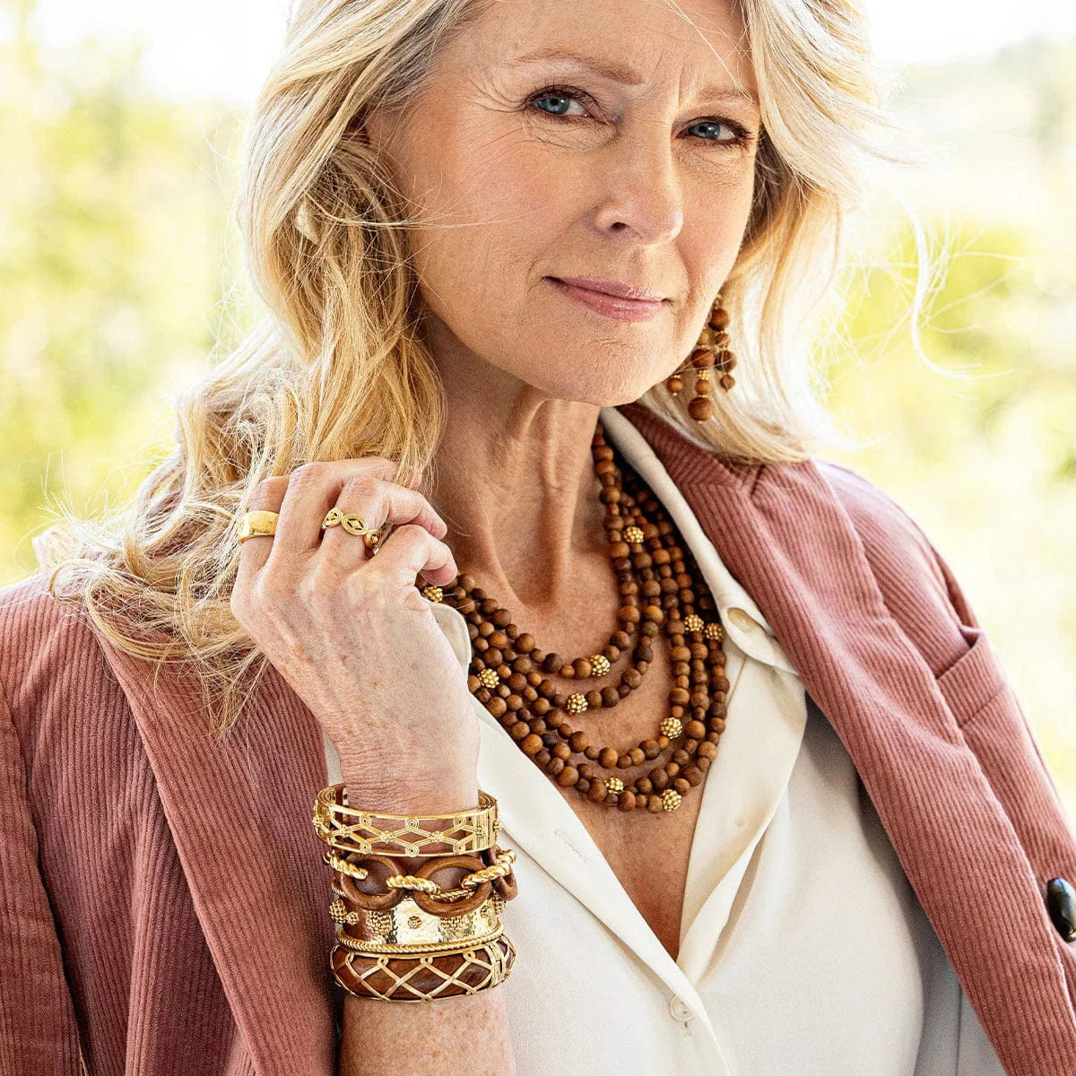 Our twist on classic statement pearls, this subtly striking necklace is composed of five strands of lustrous teak beads that are hand-carved into decadent little orbs and embellished with exquisite details like a sprinkling of golden berries. Inspired by Mother Nature who is a masterclass in slow beauty and how to make an impact in an understated way — or a grand entrance when she wants to.