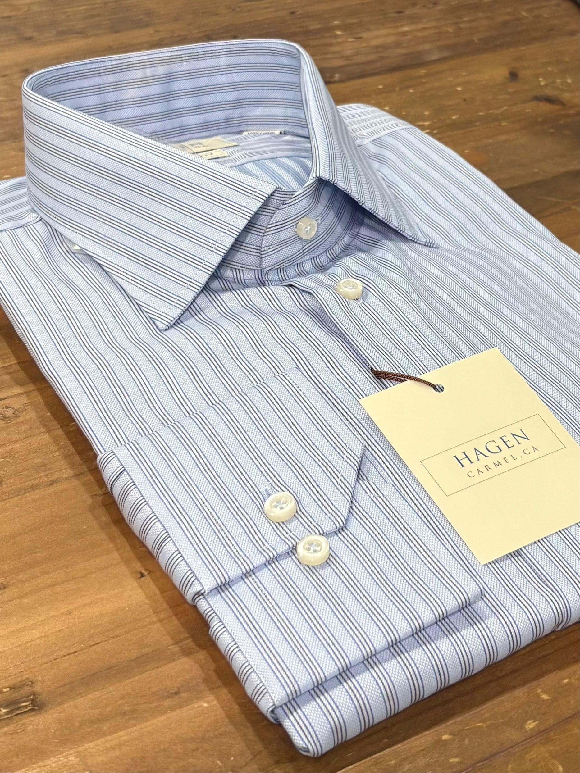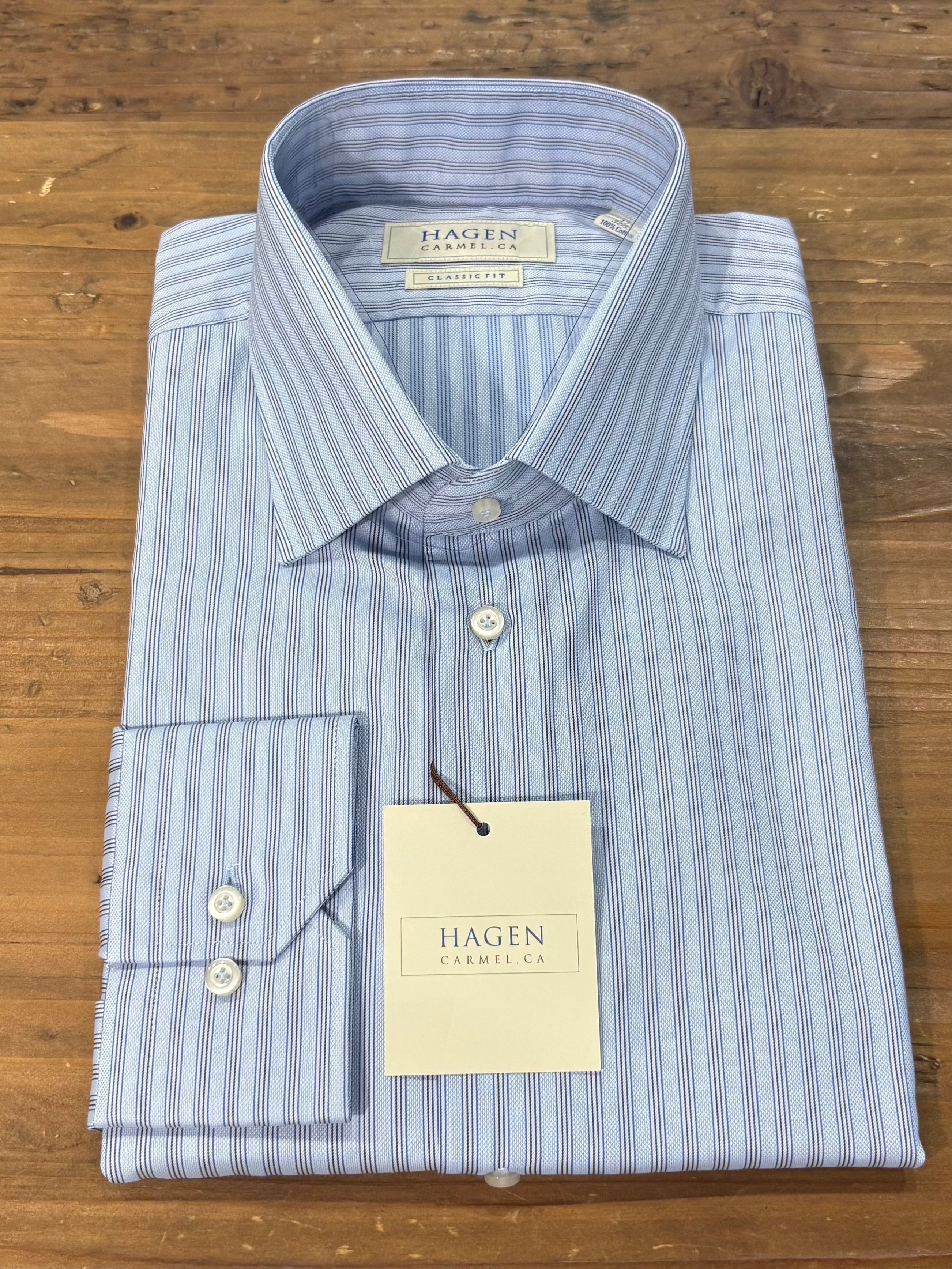 Hagen Carmel textured stripe blue dress shirt is ideal for a change up from a regular solid shirt. Wear for business casual days or pair with navy suit or blazer.