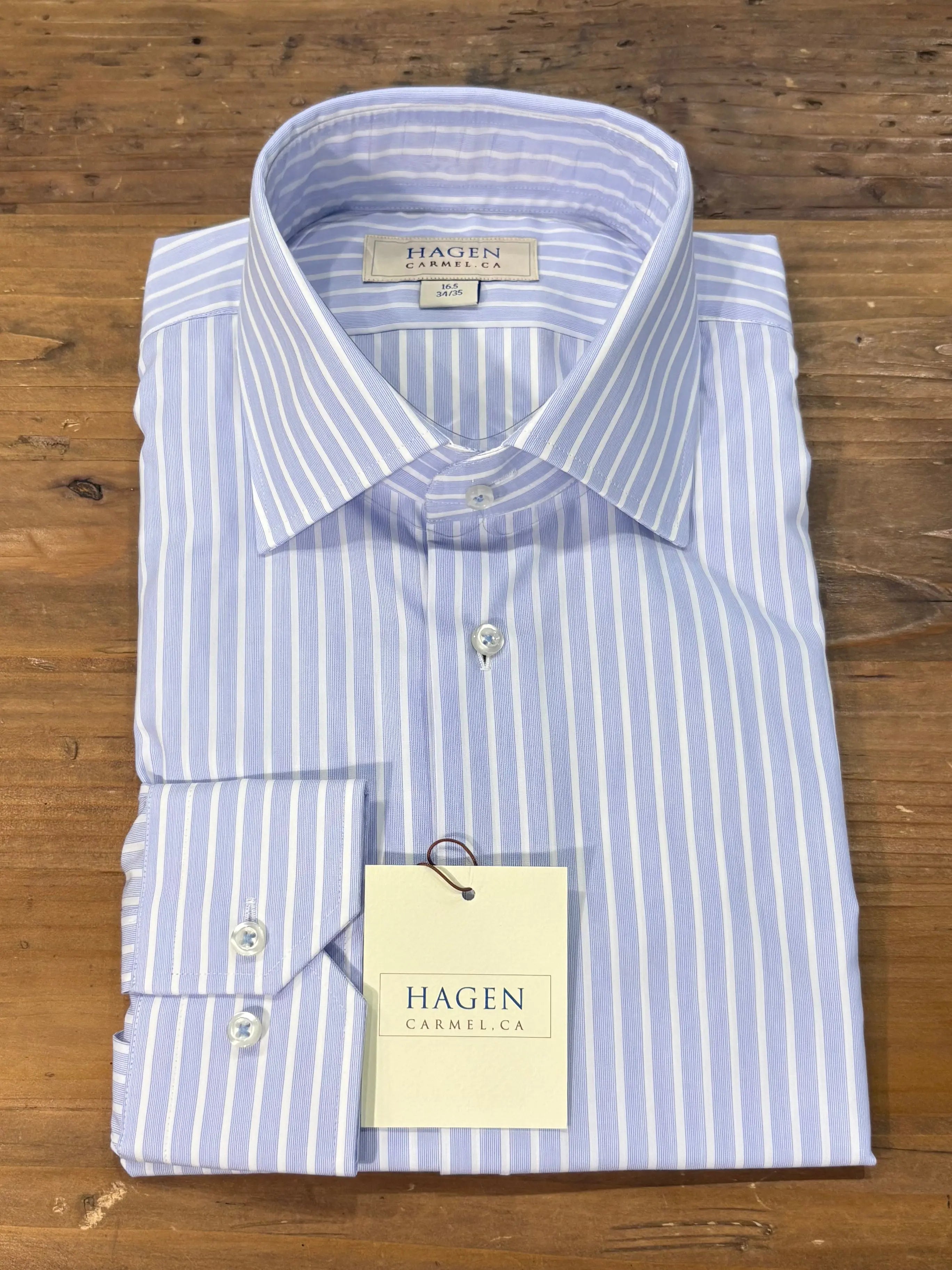 Hagen of Carmel blue framed awning srtipe dress shirt made from 100% cotton with a spread collar. Indulge in the luxurious feeling and impeccable look of this Hagen of Carmel dress shirt.