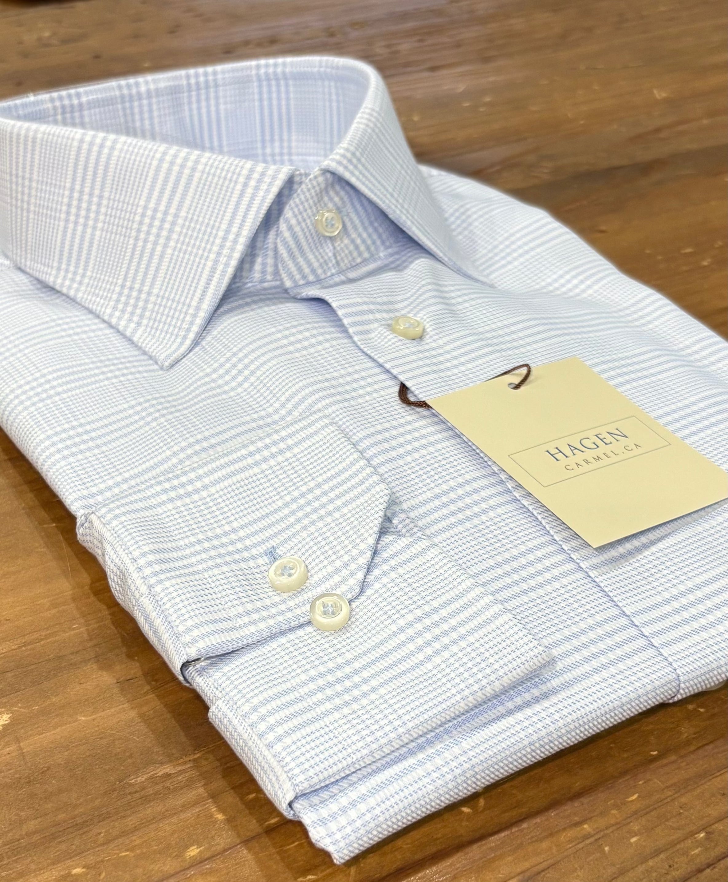 A blue and white glen plaid dress shirt is one of those patterns that sits right between solid and bold — it’s distinctive up close but reads almost like a textured solid from a distance. That makes it extremely versatile in both business and smart-casual settings
