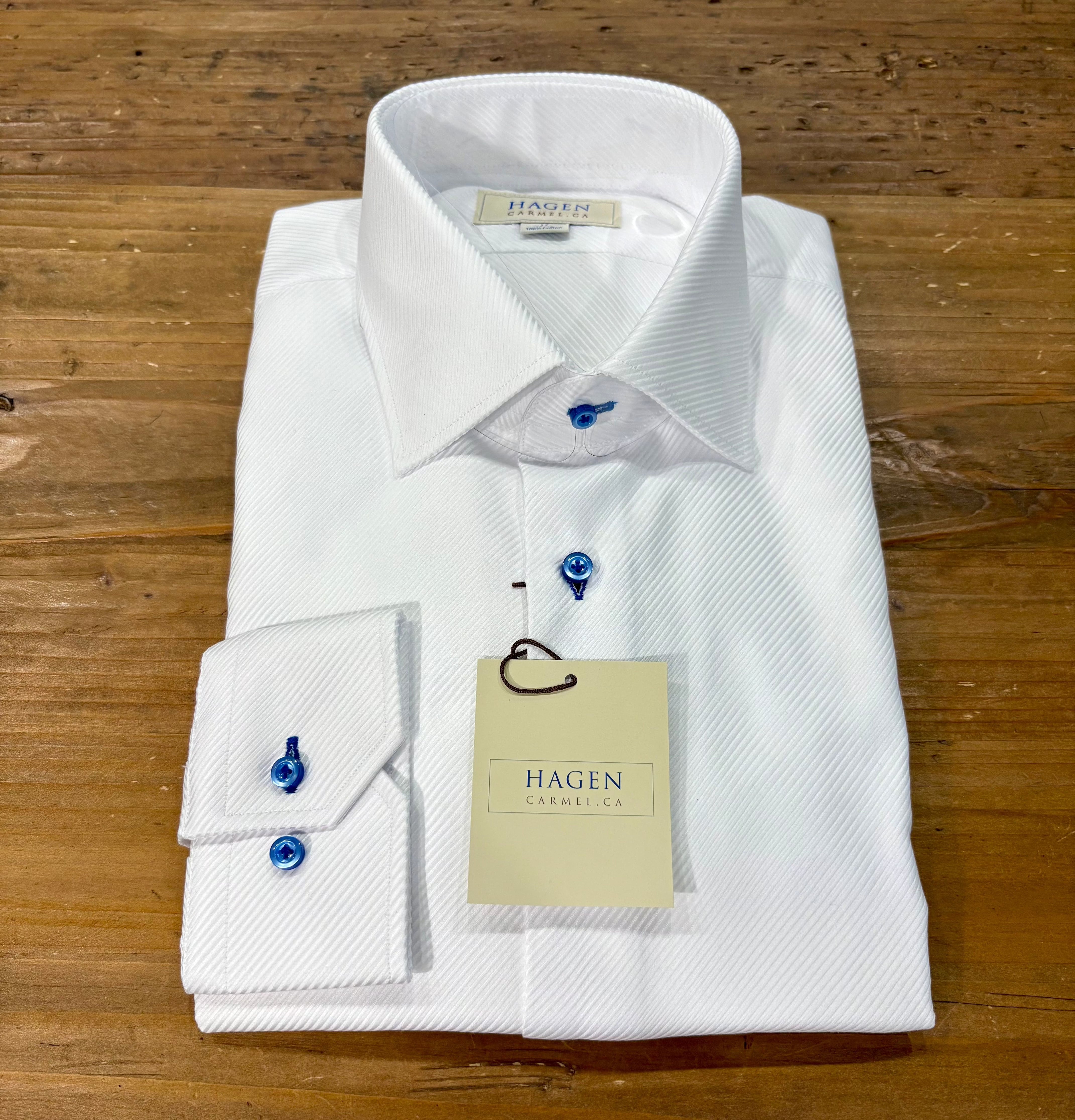 Hagen Carmel White Steep Twill Dress Shirt. Note the blue buttons and beautiful texture make this a special dress shirt.