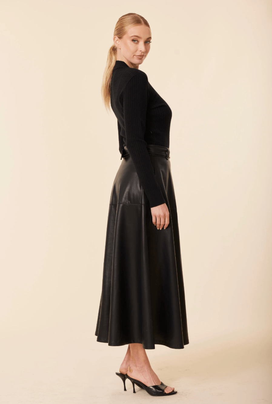 Make a statement with the sophisticated black faux leather A-line maxi dress, complete with a matching belt for a polished finish. The flowing silhouette and sleek texture make it a versatile women’s fall fashion piece, perfect for pairing with your favorite classic heels for day-to-night elegance.