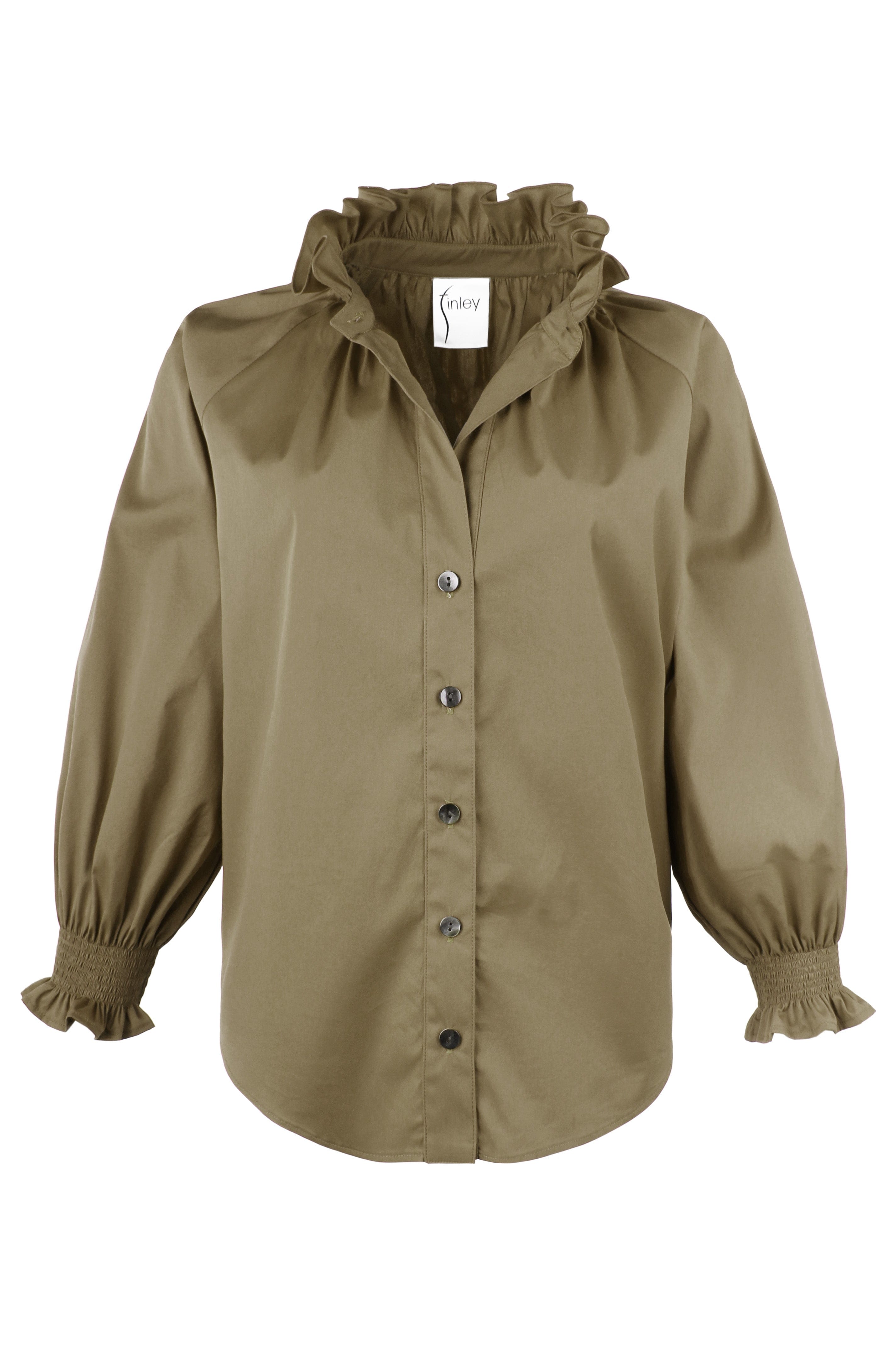 - Finley "Fiona" ruched silky black poplin shirt with ruffle trim along the neckline