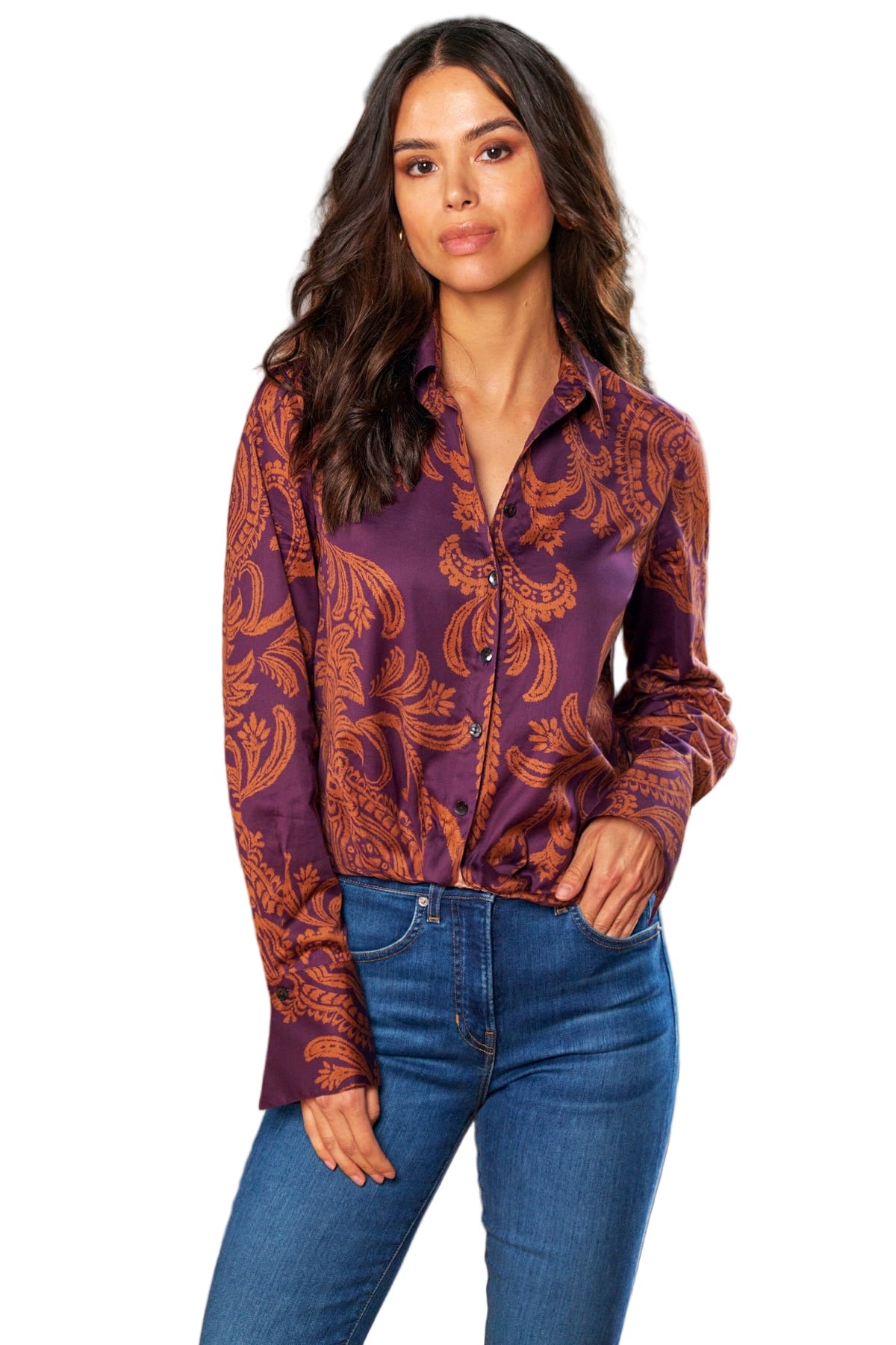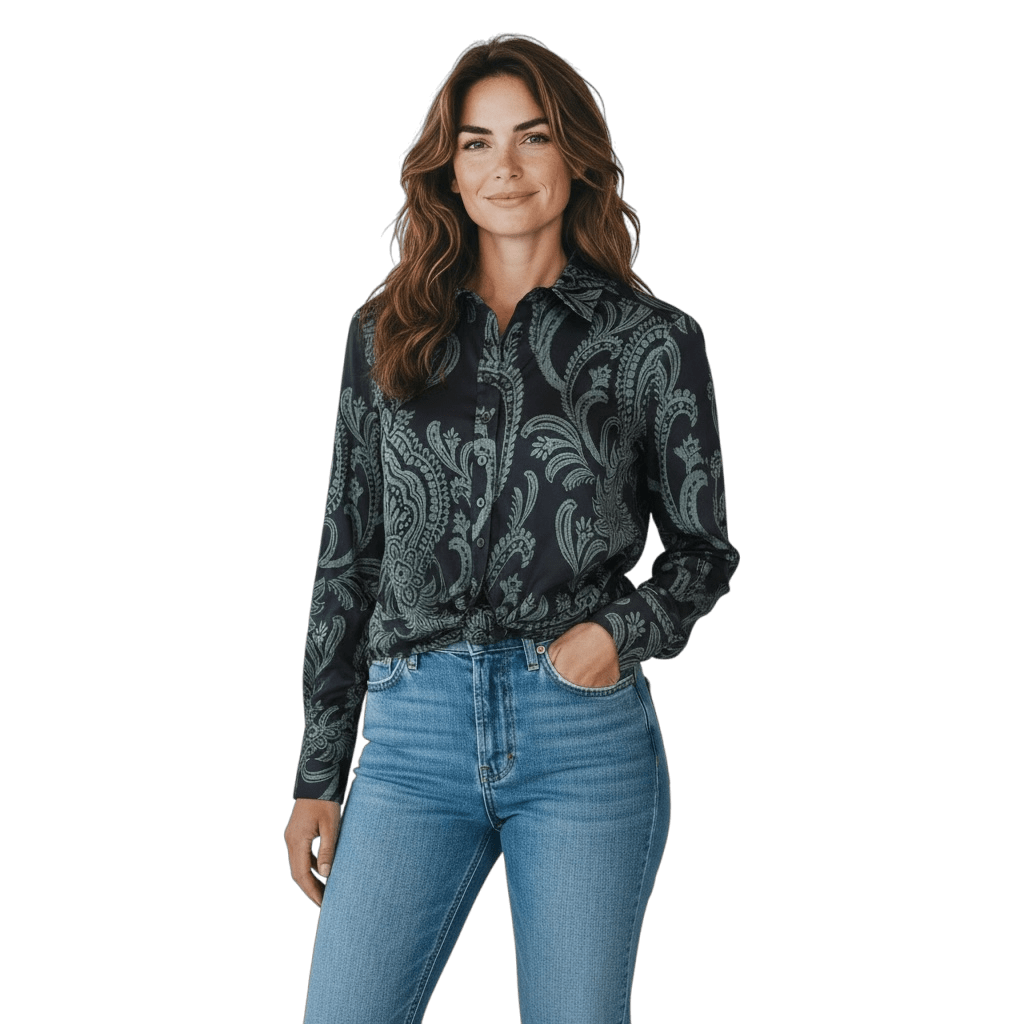 Bring effortless elegance to your wardrobe with the Finley Moxie Bohemian Paisley Shirt. Designed with a relaxed, modern silhouette, this women’s long-sleeve button-down shirt features a vibrant paisley print inspired by boho-chic style. Crafted from lightweight, breathable fabric, it drapes beautifully and transitions seamlessly from day to night.