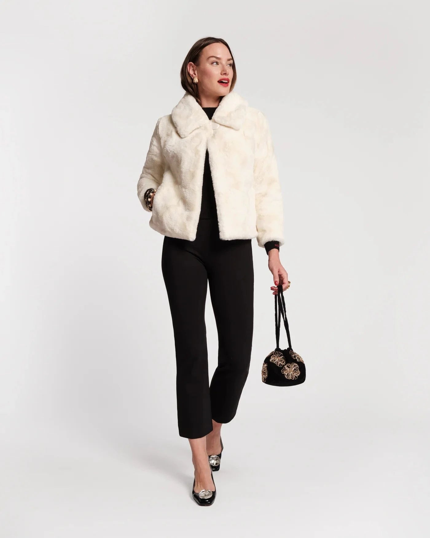 Crafted from plush velvet, this mini pouch takes on a dazzling new look with hand-beaded floral beading scattered across the surface. The softly structured shape and cinch-top closure give it an easy elegance, while the long straps make it effortless to carry. A festive twist on a favorite silhouette, perfect for evenings out or adding sparkle to the everyday.