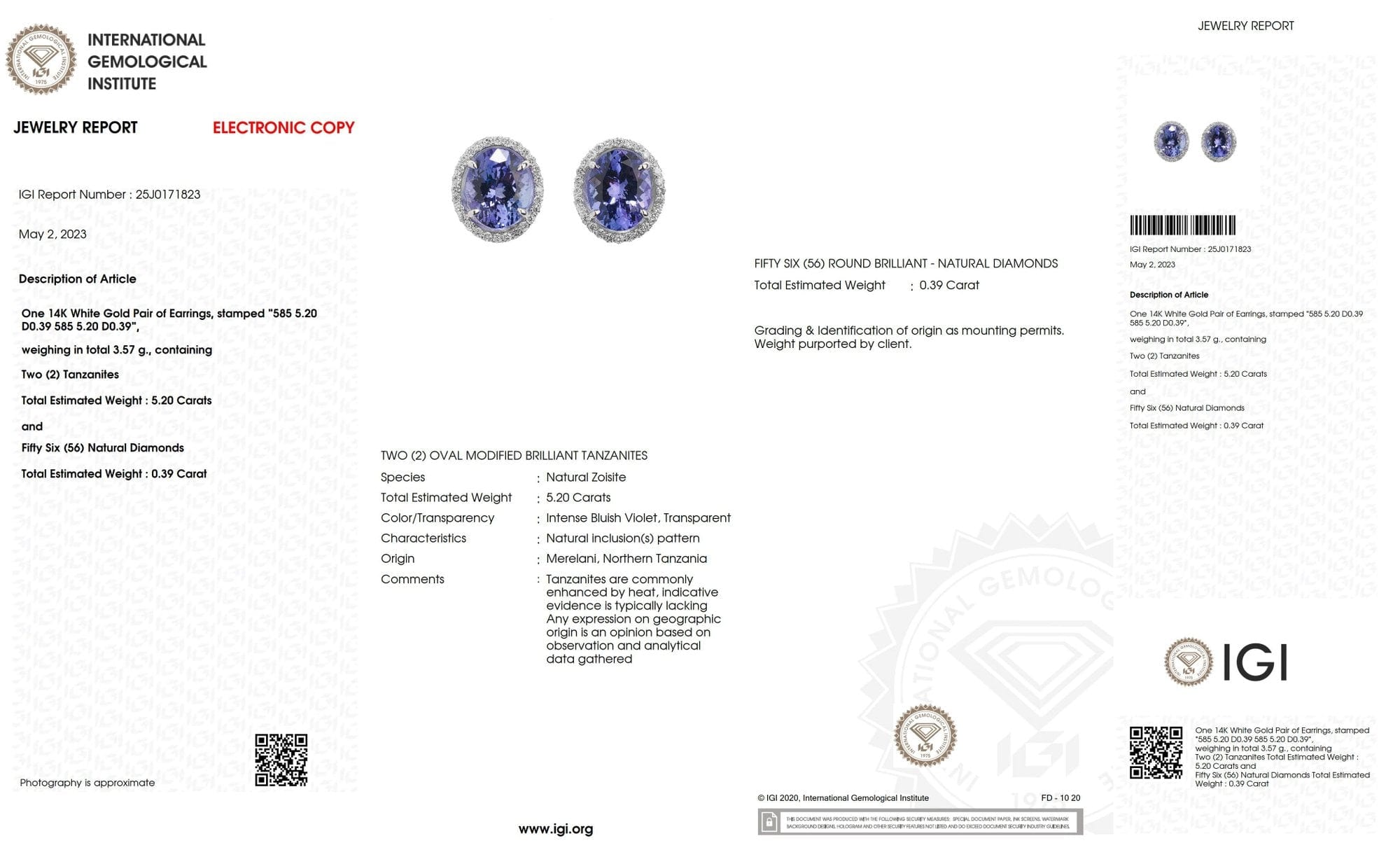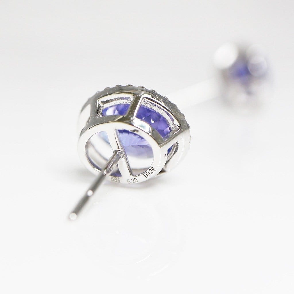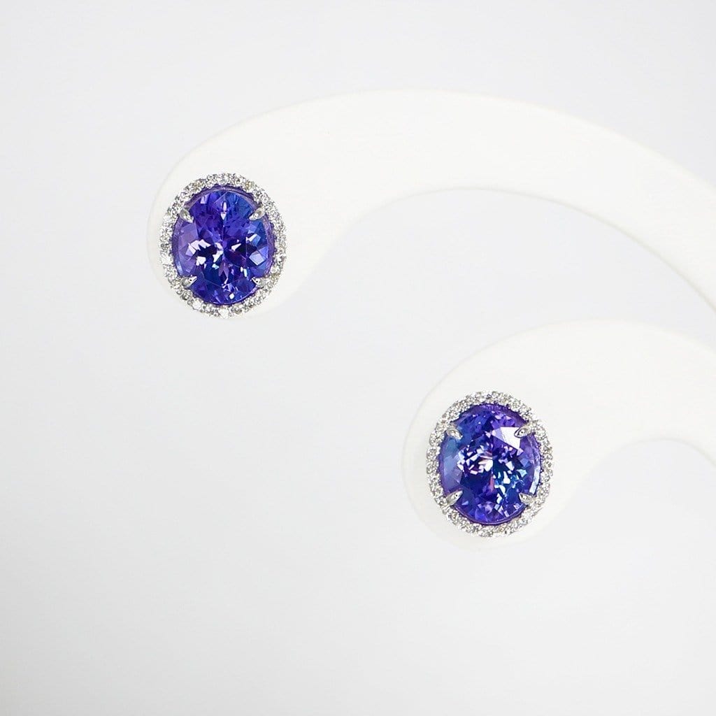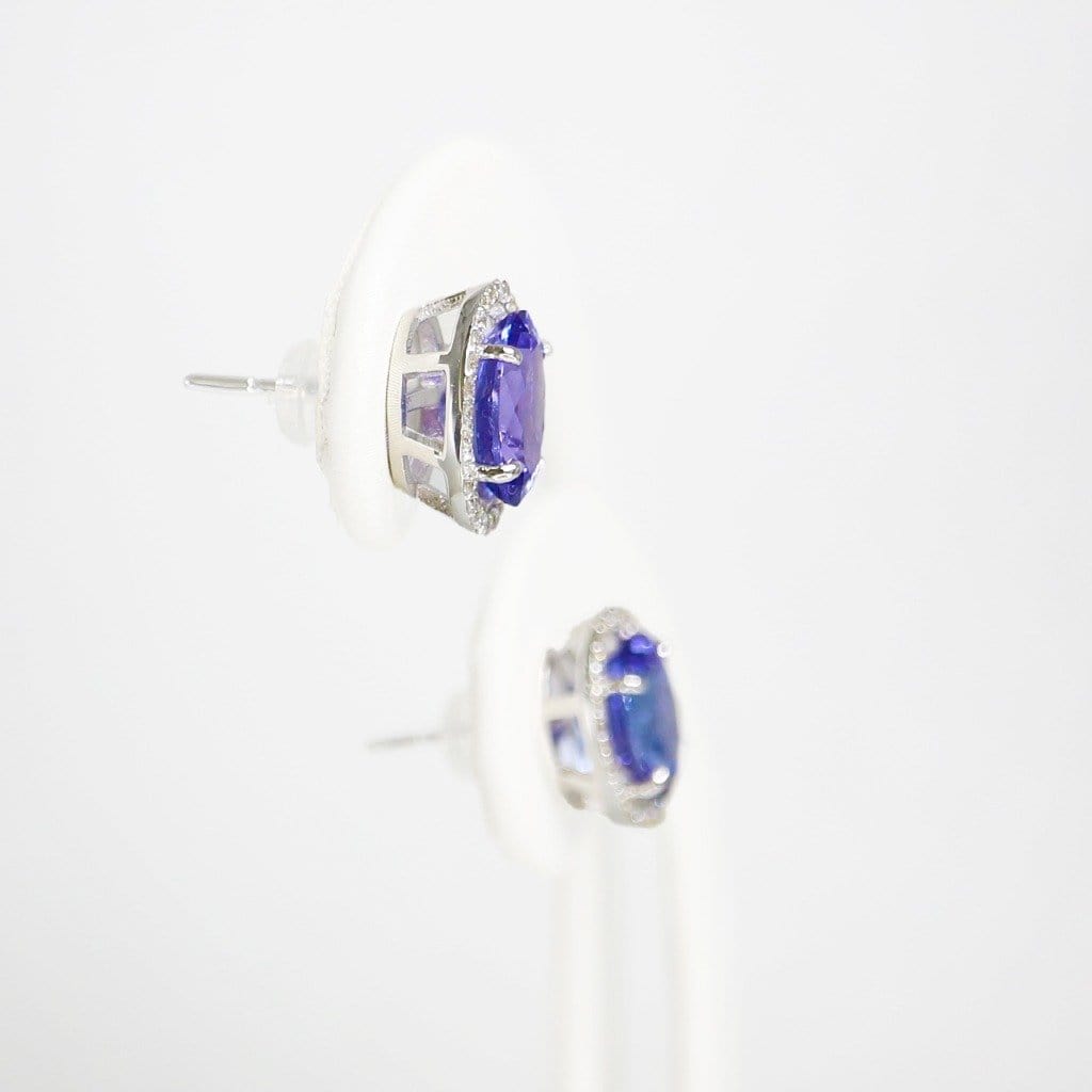This pair of earrings showcases 5.20 carats of natural Intense Bluish Violet Tanzanite and 0.39 carats of IGI-Certified diamond stones set in 14kt white gold.