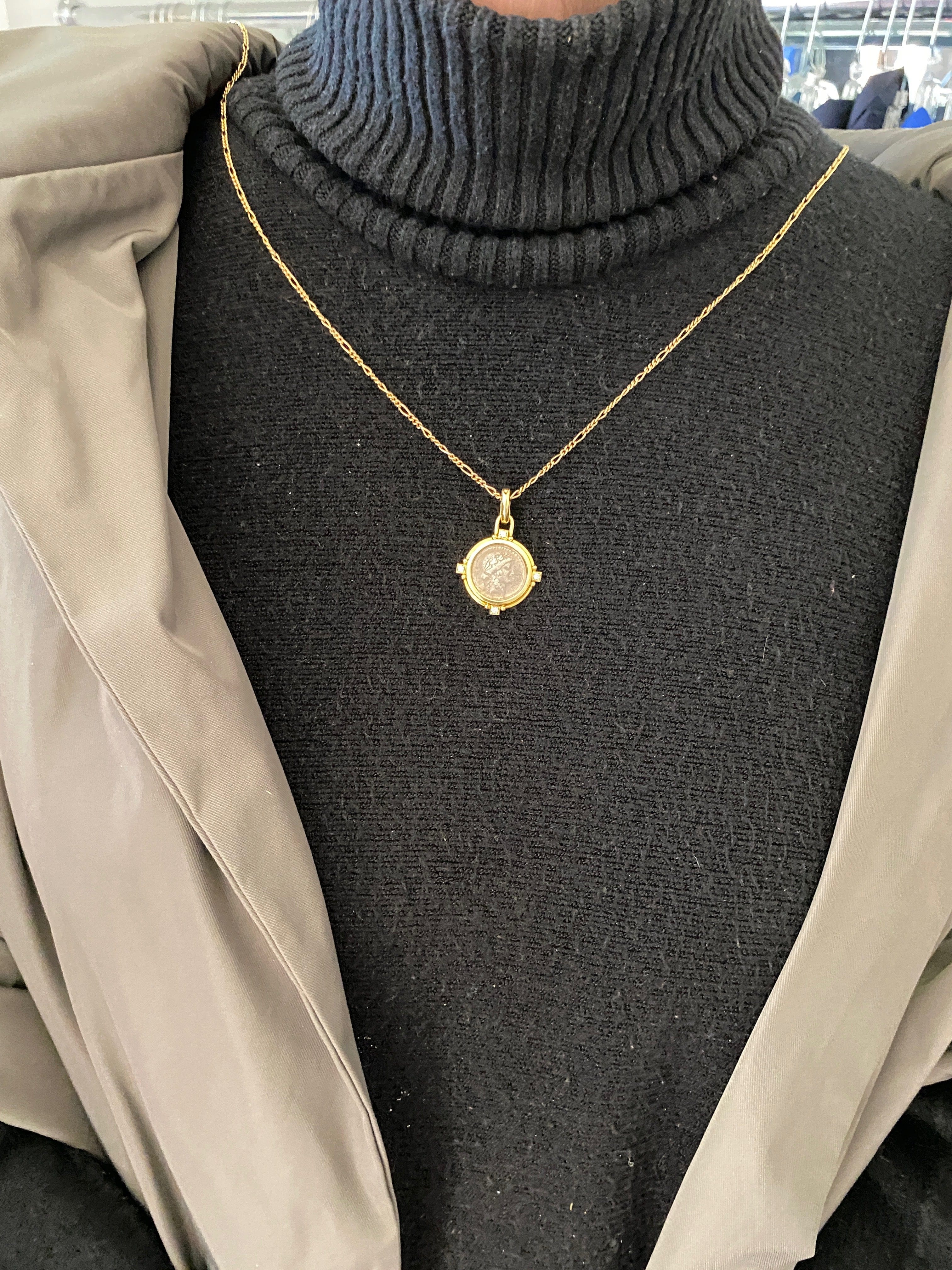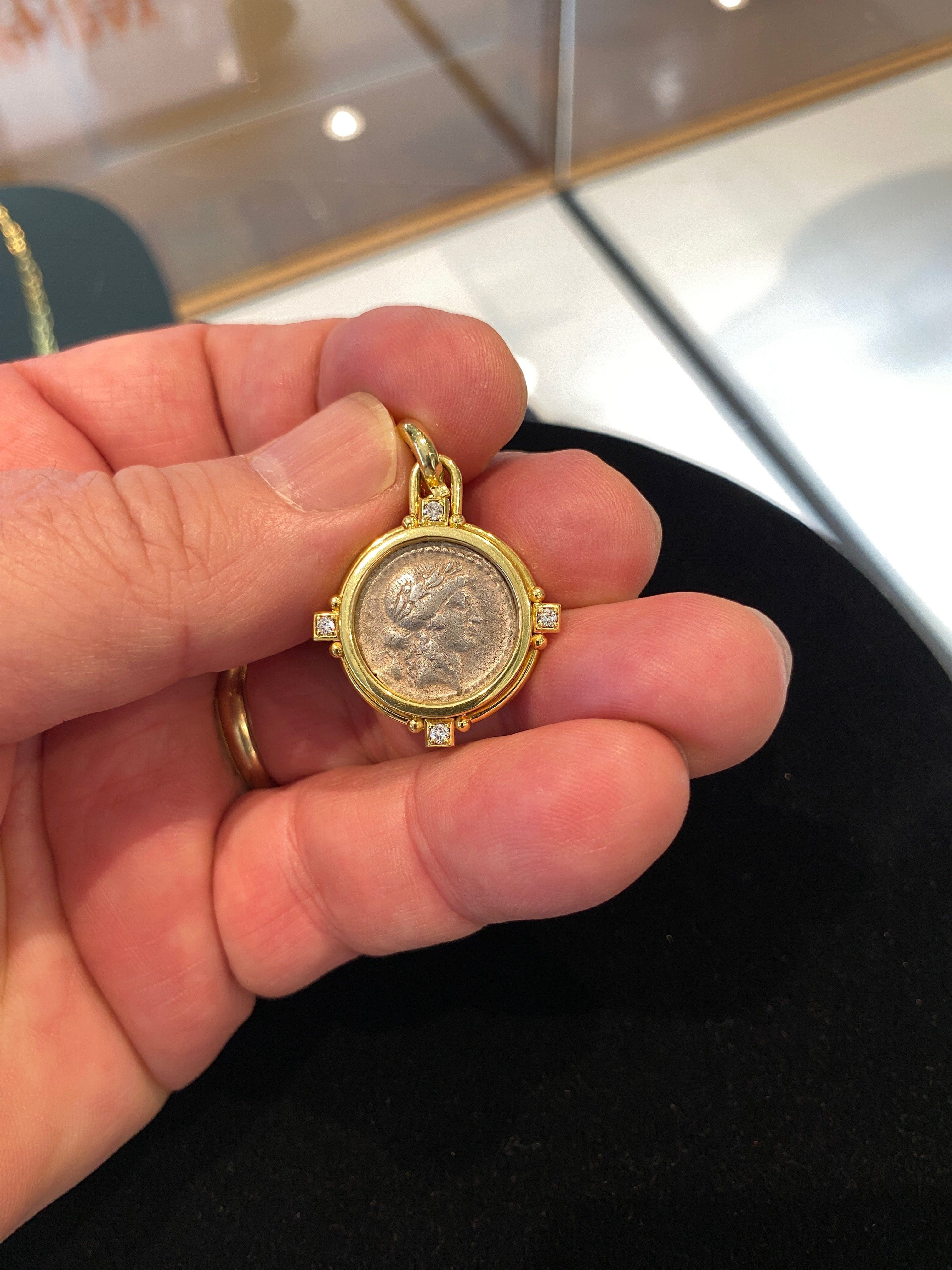 Channel the beauty and mystery of ancient times with the Mazza Ancient Coin Pendant. Exquisitely wrapped in 14k gold with sparkling diamond accents, this pendant is a testament to history and luxury. Complete with a 14kt gold clasp, elevate any outfit with this timeless piece.