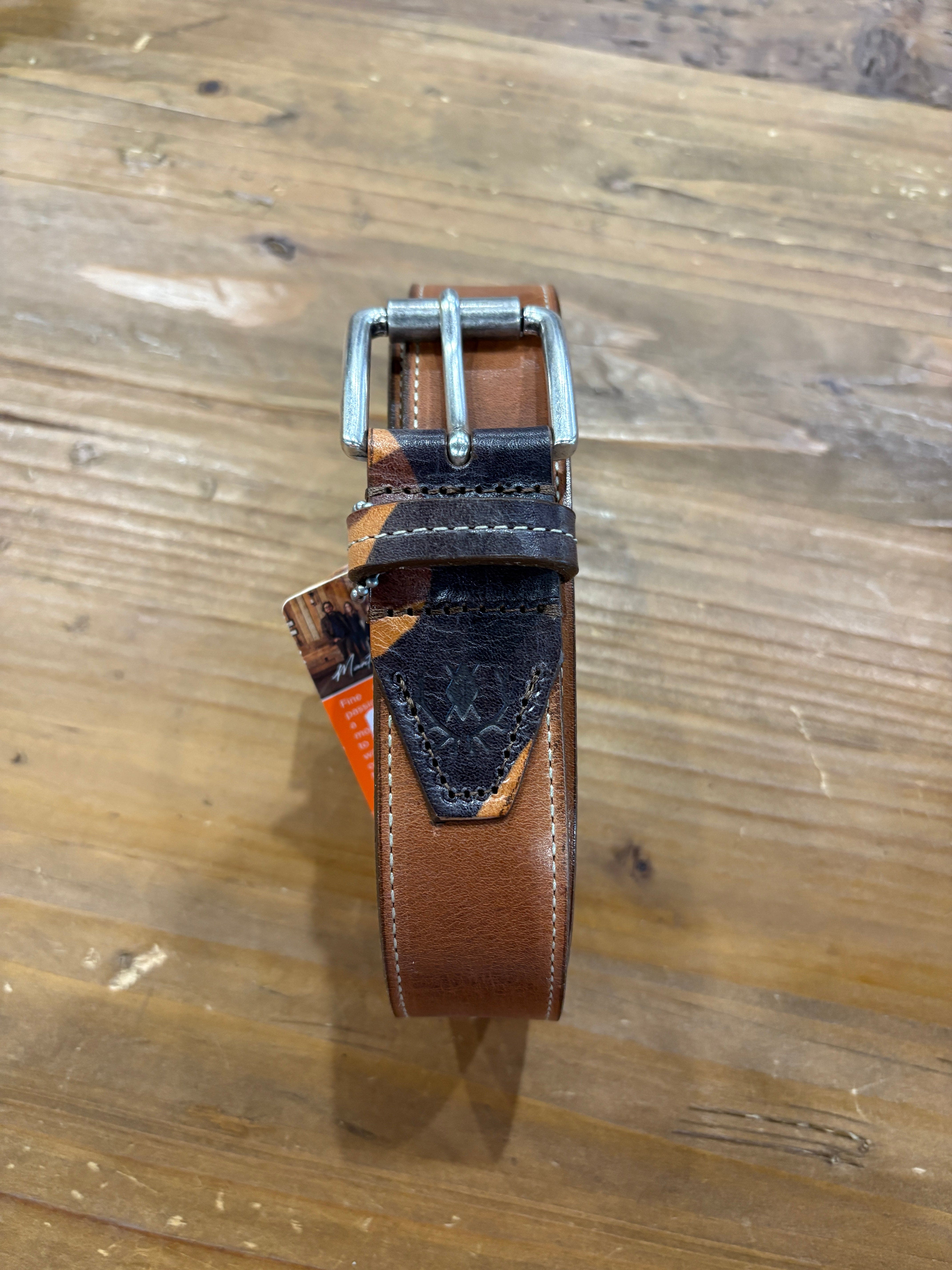 Experience the luxury of Martin Dingman's Montana Belt in Saddle Tan - handcrafted with 1 3/8" of exquisite Italian saddle leather, complete with solid brass Italian hardware and equestrian saddle leather lining. This accessory is elevated by an antique silver finish and the camo treatment near the buckle