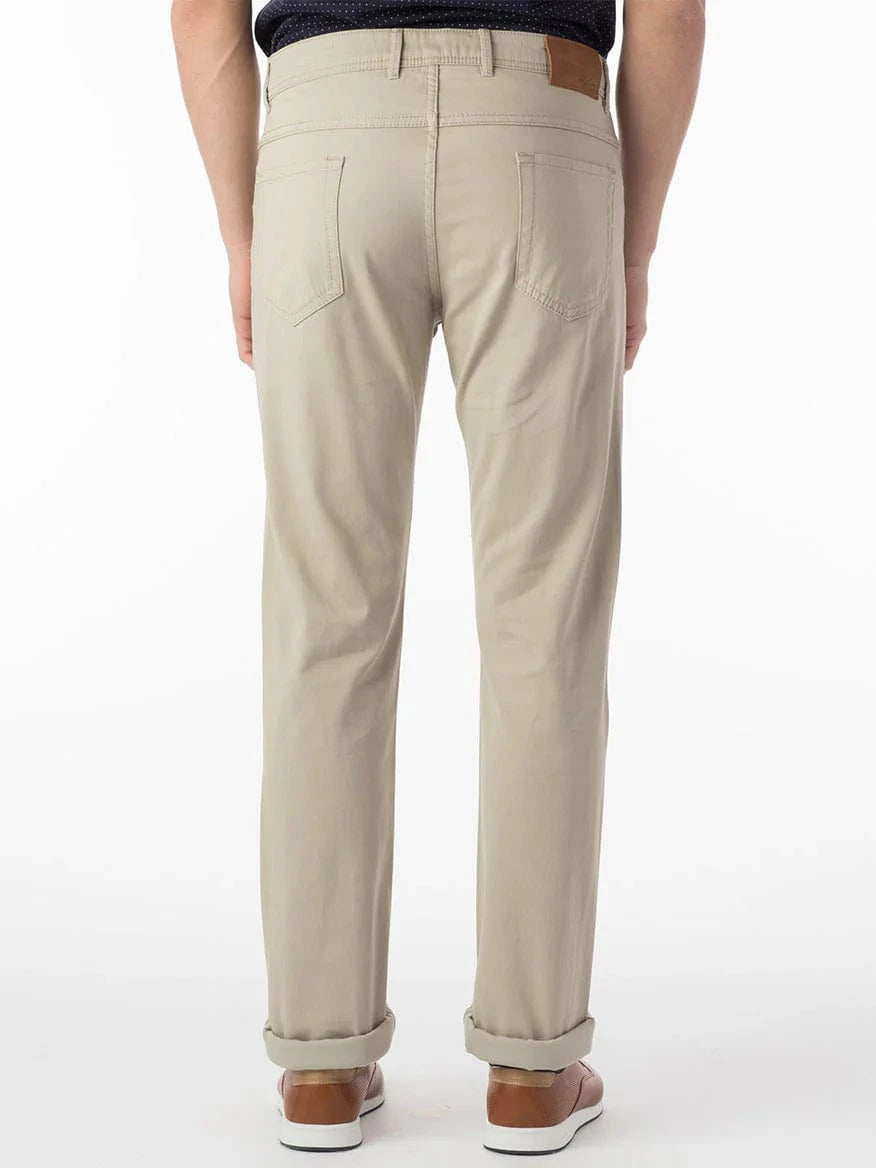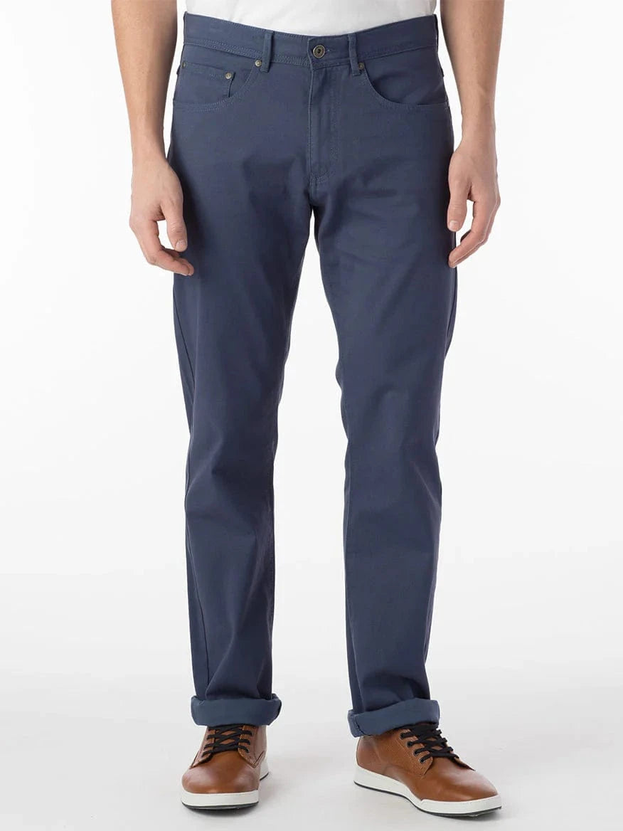 These premium stretch twill pants, made from a blend of pima cotton and elastane, use an advanced dyeing technique that keeps colors vibrant wash after wash. Professionally laundered for a soft feel and designed with just the right stretch, they deliver outstanding all-day comfort. Perfect as modern business casual wear throughout the year, they feature a 10 1/4” rise, 35 1/2” inseam, Knee 17 1/4 and 14 3/4” bottom width. Details include front jean pockets with logo rivets, a watch pocket, back patch pockets, sturdy belt loops, and precise topstitching for a refined look.