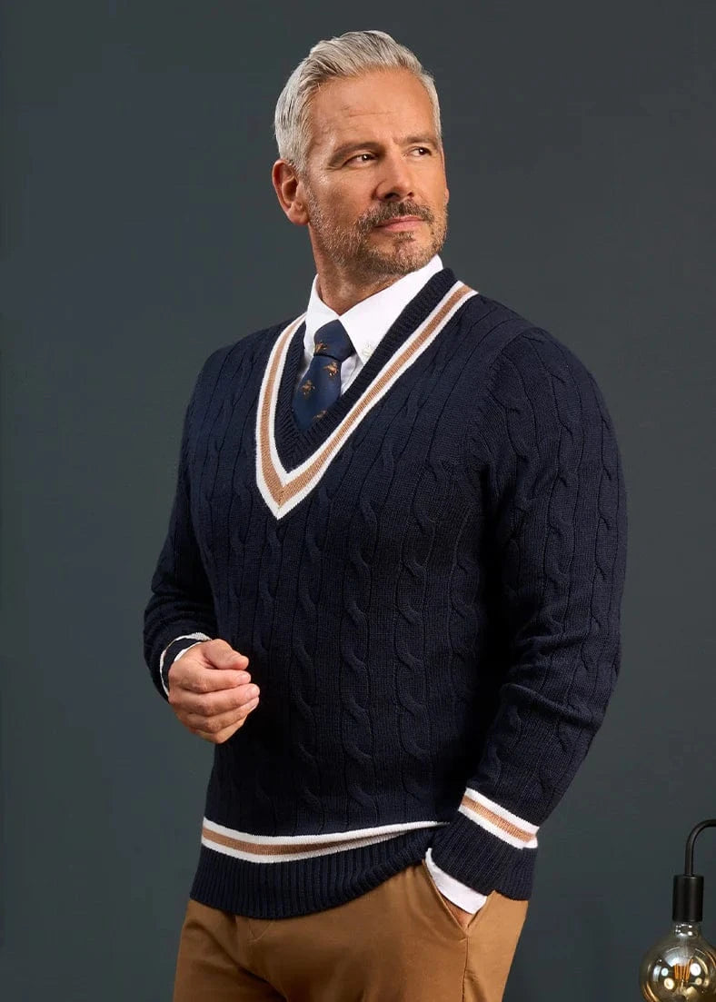 Crafted from fine merino wool, our Navy V-neck cricket sweater offers a modern interpretation of a classic design. Showcasing an elegant cable pattern, it is detailed with a distinctive trim along the neckline, cuffs, and hem for a refined finish.