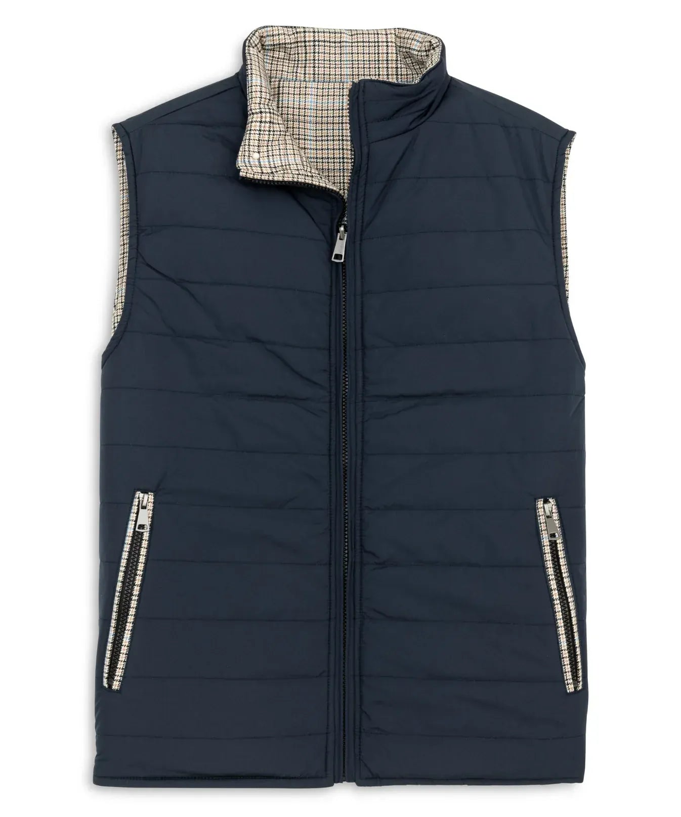 This reversible houndstooth vest is expertly designed to seamlessly complement your style. Featuring a practical two-way zipper and refined channel quilting, it provides enduring comfort and a sophisticated look, making it a must-have for your wardrobe.