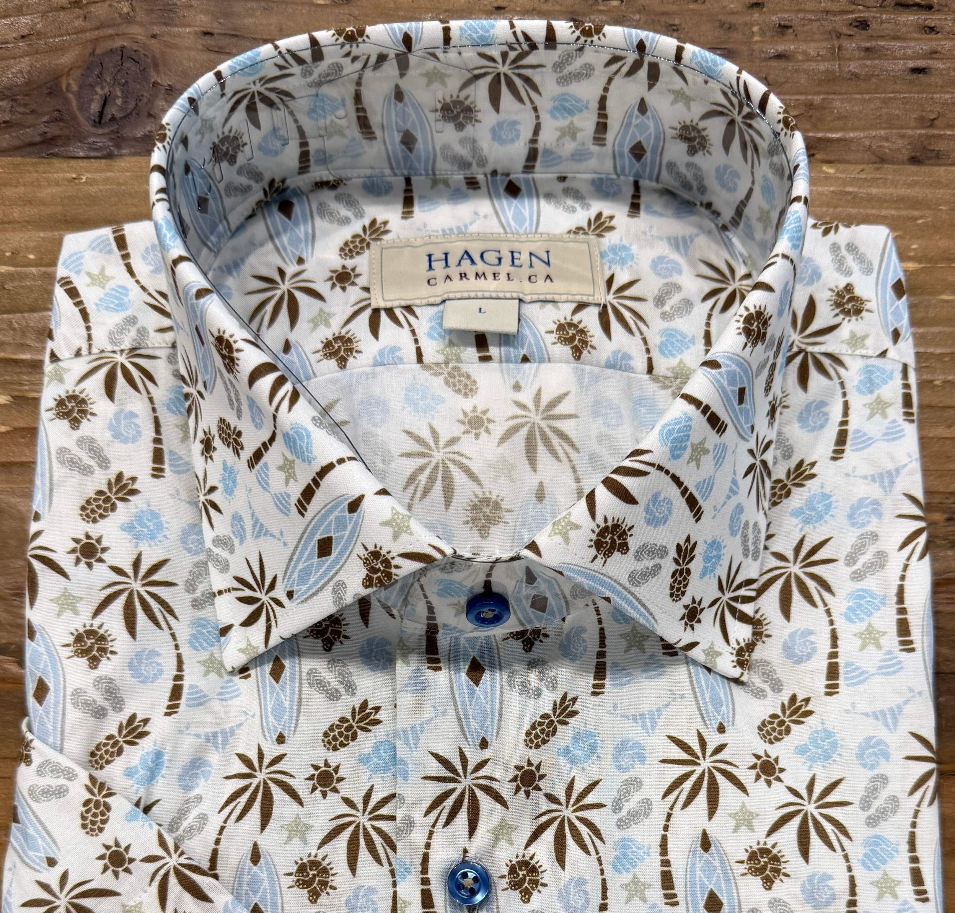What more iconic for a short sleeve summer shirt than this cotton, spread collar shirt in a print featuring an Island flare with Palm Trees and Surfboards. Enjoy for years to come. Made with a fine cotton fabric.