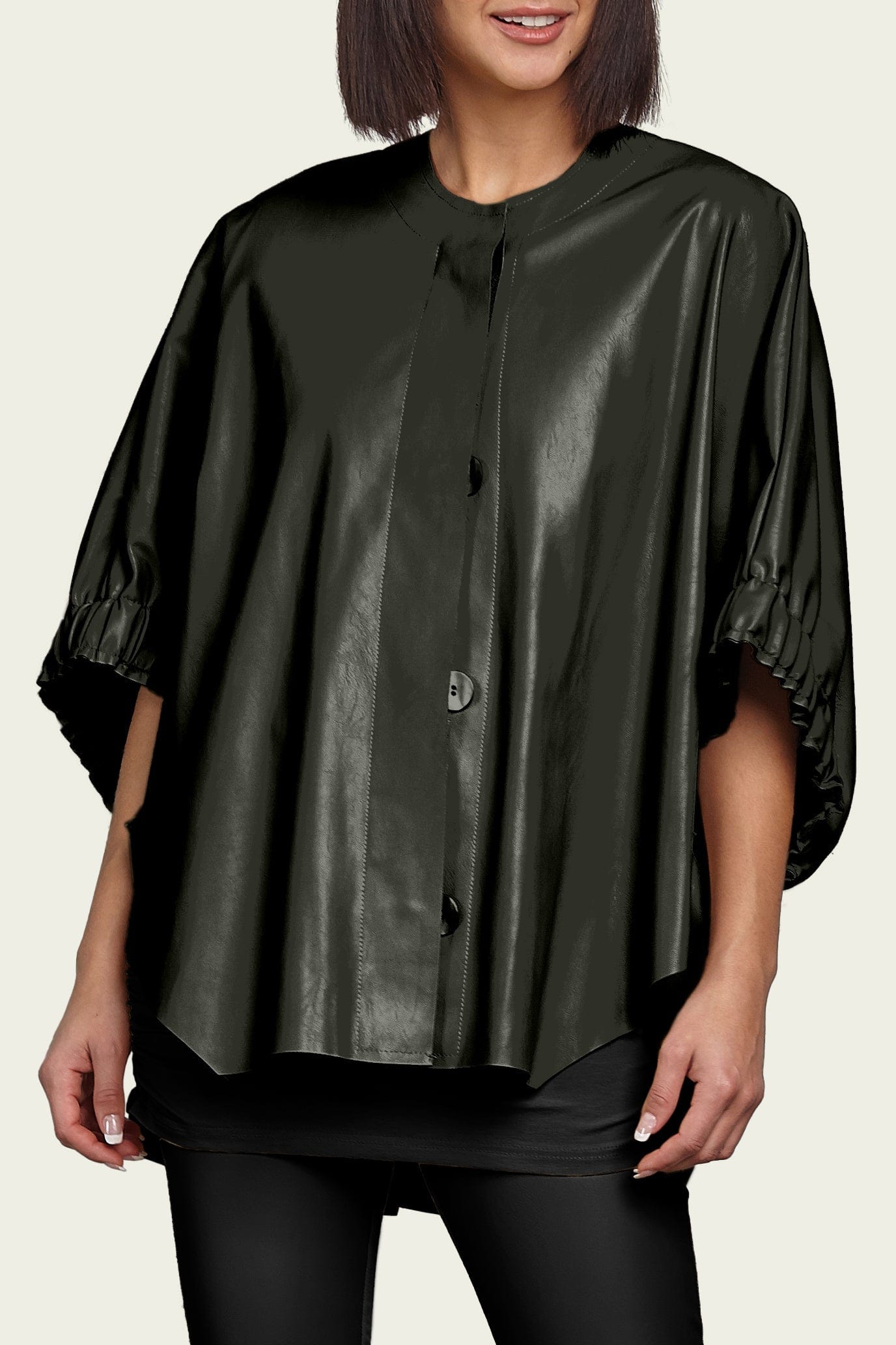 Elevate your wardrobe with the irresistible charm of 'The Marvelous Mrs. Maisel' with this exquisite vegan leather creation. It exudes the show's vintage chic with its vest-like cut and sophisticated elbow sleeves. One size items from Planet are best for sizes 4-14). The buttoned front and drop shoulders add a touch of the show's playful yet poised elegance, perfect for the woman who commands the room with her style and wit.