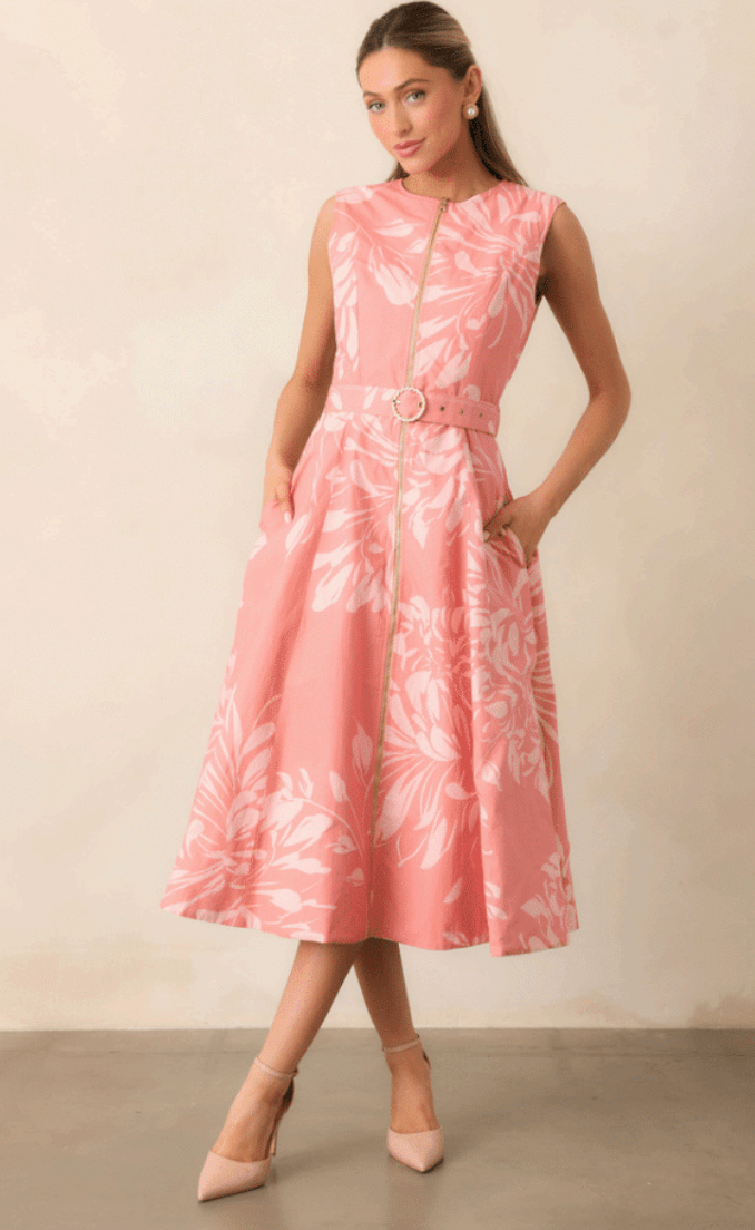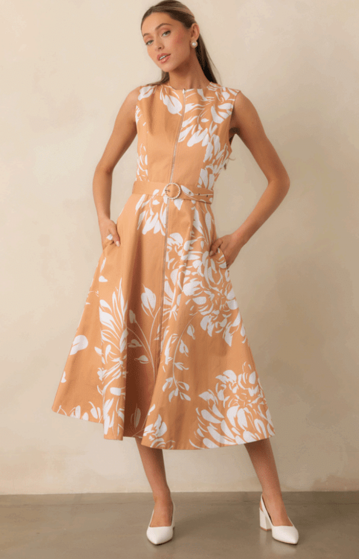 Turn heads with the Prosperina Eliana Reversible Midi Dress, designed for fearless style. Featuring a bold zipper front and a cinching belt at the waist, this dress effortlessly accentuates your silhouette. Its reversible design offers two distinct looks in one, perfect for making a daring statement wherever you go.