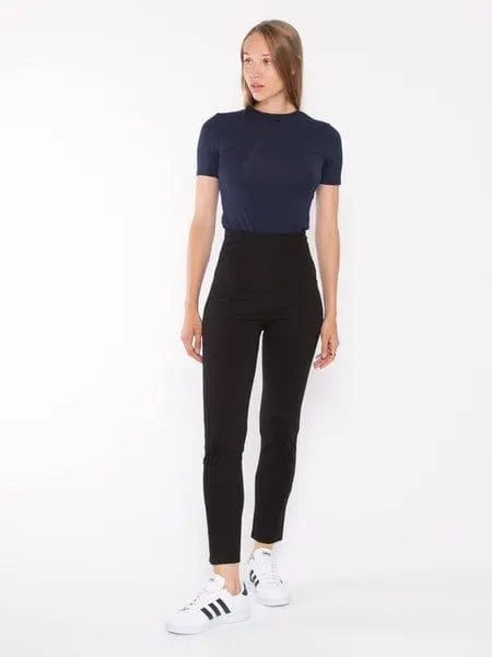 A high-waist, ankle length inseam pant made from Ponte knit.  Gives the appearance of a structured look with all the comfort of a soft knit.  The square hem and high waistline are slimming and elongating on all body types.