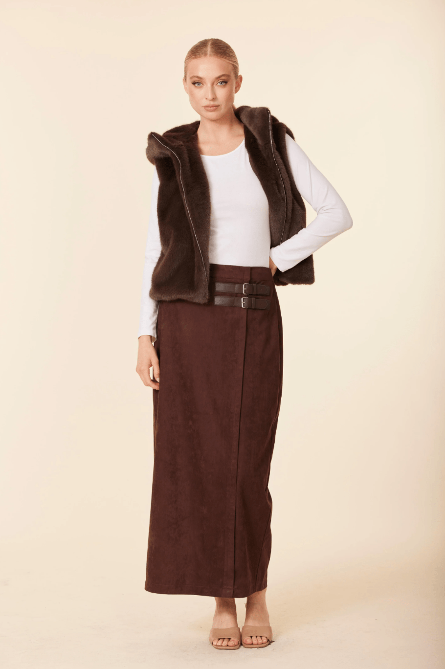 Elevate your Fall wardrobe with this rich brown suede maxi skirt, featuring chic side buckle accents for a modern twist on a classic silhouette. The ankle-length design offers a sleek, elongating effect, making it perfect for pairing with sweaters, blouses, or boots. A timeless women’s fall fashion piece that blends sophistication with cozy seasonal style.