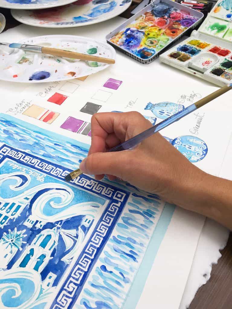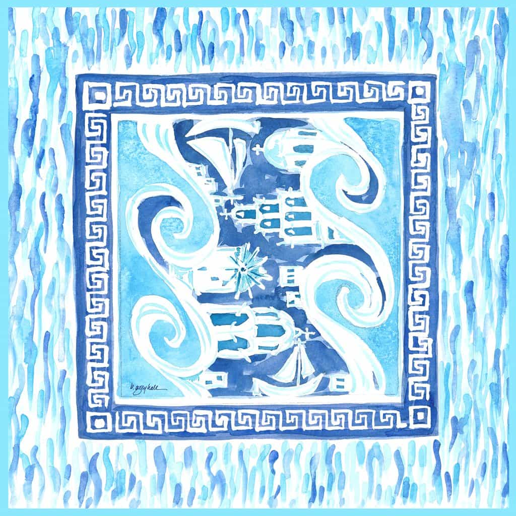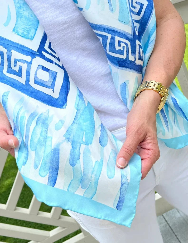 Be whisked away with this Mediterranean silk scarf reminiscent of a sailing venture, island hopping from Santorini to Porto, Spetses and Hydra. Interwoven into the design is the iconic Greek Key. A Mykonos windmill sits against a skyscape of whitewashed domed buildings nesting on arid cliffs.