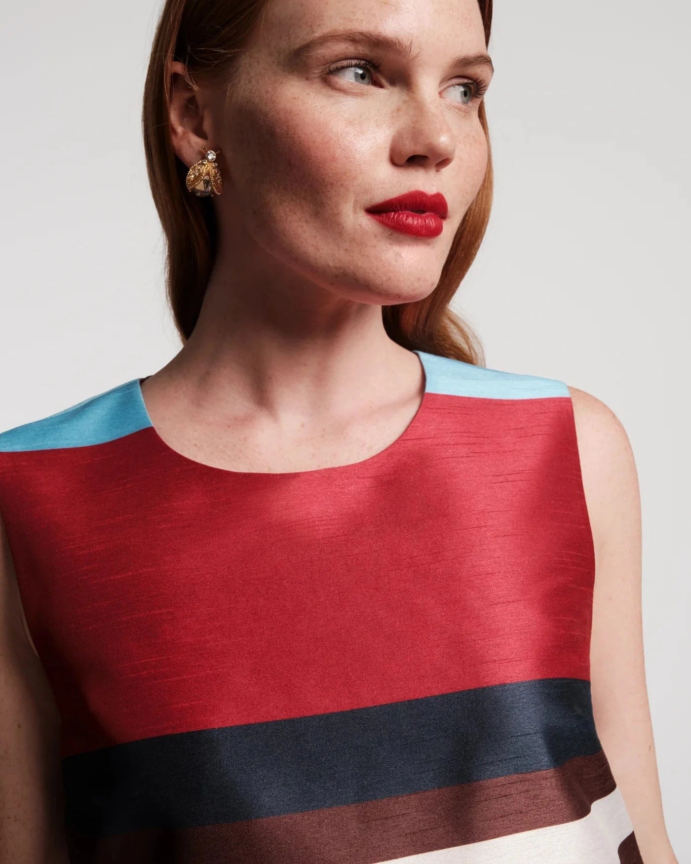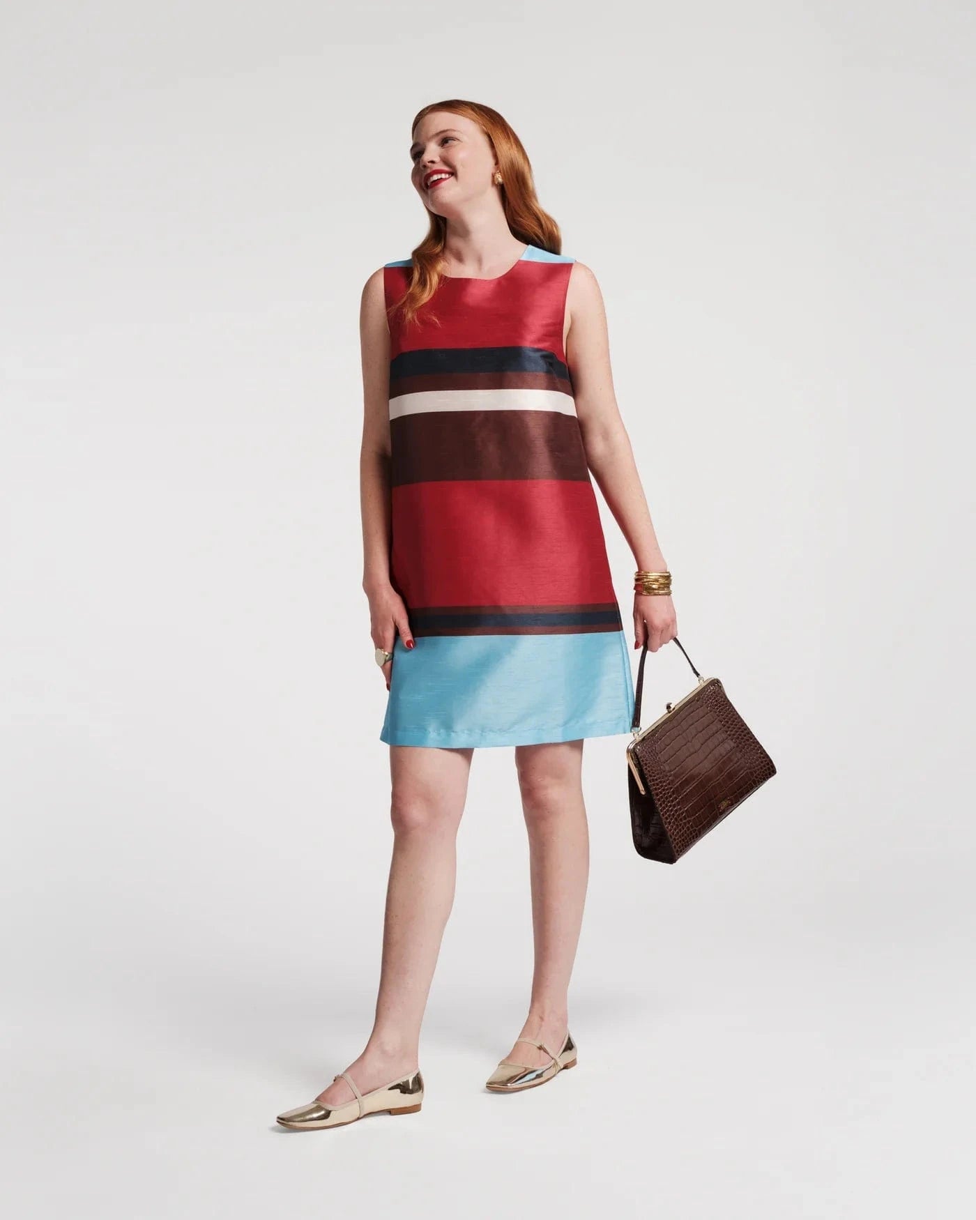 Meet the Sylvie Dress, our take on the classic shift, reimagined for fall in a polished finish that elevates the silhouette above its cotton cousin, the Lily Shift. Sleek, sleeveless, and stunning, Sylvie is introduced in our Sublime Stripe, a playful take on a classic stripe in a mix of reds and blues. Crafted with thoughtful construction and a keen eye for proportion, she’s for the woman who wants polish with personality.