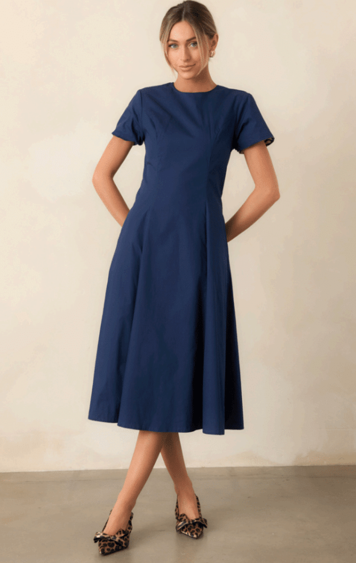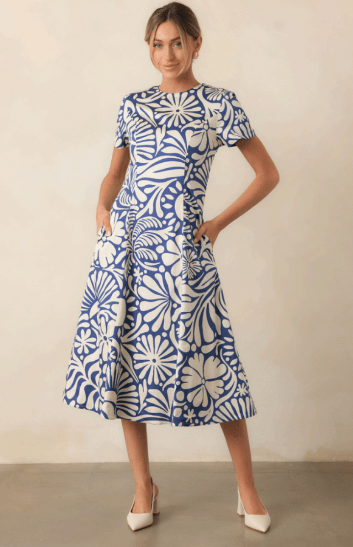 Discover the playful charm of the Prosperina Margot Reversible Midi Dress, featuring a floral pattern on one side and a sleek navy on the other. Effortlessly switch up your look with a simple flip, while the back zipper ensures a perfect fit every time. Perfect for any occasion, this dress brings double the style and fun to your wardrobe.