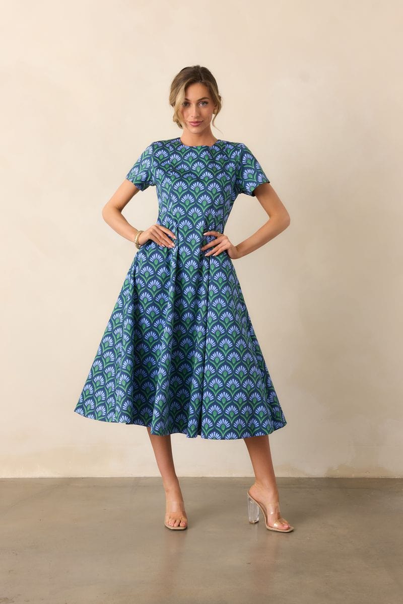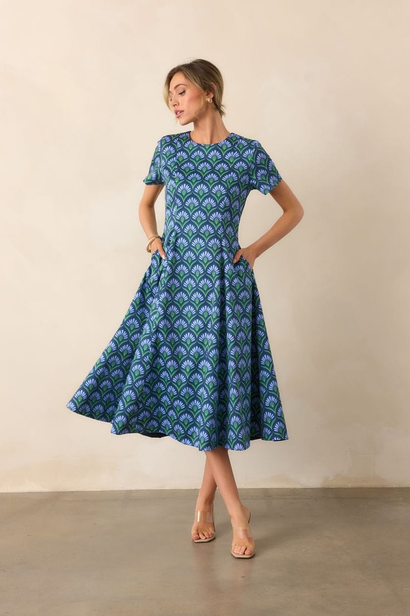 The Prosperina Margot Reversible Midi Dress offers versatile style with its innovative design. One side features a vibrant print that adds personality to your look, while the reverse side is a classic navy, perfect for understated elegance. Crafted with quality materials, this short sleeve midi dress transitions seamlessly from casual daytime wear to polished evening attire, providing two distinct outfits in one piece. Its reversible feature maximizes wardrobe options without compromising on comfort or fit, making it a practical and stylish addition for any fashion-conscious wardrobe.