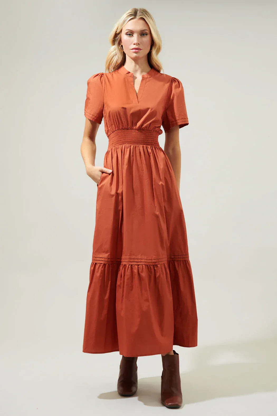 Begin your exciting fairytale with a look as sweet as the Belraj Poplin Maxi Dress! It includes a split neckline framed by short sleeves tops a flowy midi skirt that's separated by a smocked waistline. Pleated layer details sweep across the bottom third of the skirt to create a single tier. Wear it to go to dinner or for a lovely afternoon event.