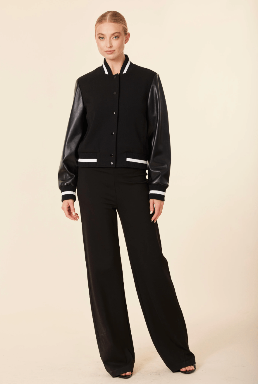 Step into sporty chic with this black varsity bomber jacket, a standout piece for your fall apparel collection. Designed with sleek faux leather sleeves, striped ribbed trim, and a classic snap-button front, this jacket brings effortless style and versatility. Perfect for layering over casual outfits or pairing with tailored pieces, it’s a modern take on timeless fall outerwear.