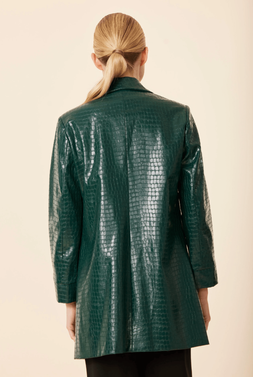 Add sleek texture to your Fall wardrobe with the croc-embossed faux leather blazer, designed with a tailored fit and open-front silhouette. This statement jacket blends modern edge with timeless sophistication, making it a versatile piece in women’s Fall fashion. Perfect for pairing with trousers, skirts, or dresses for a polished seasonal outfit.