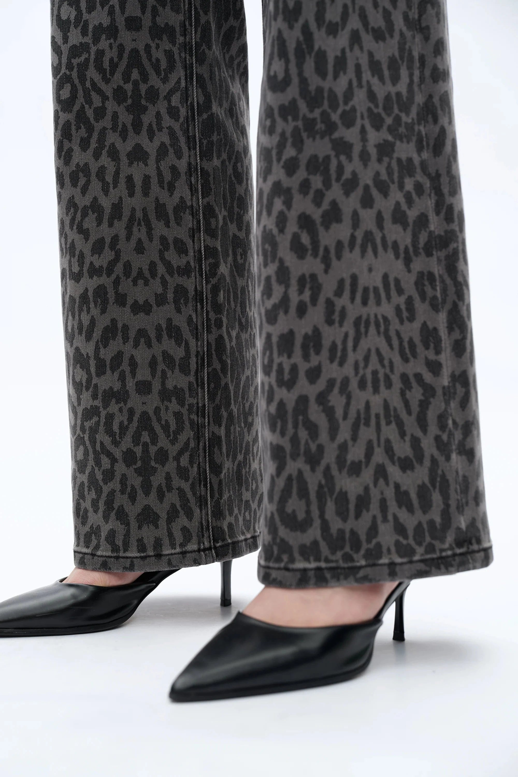 High rise leopard print wide leg jeans, five-pocket design, zipper closure, all-over leopard print, hand-faded finish on front and back