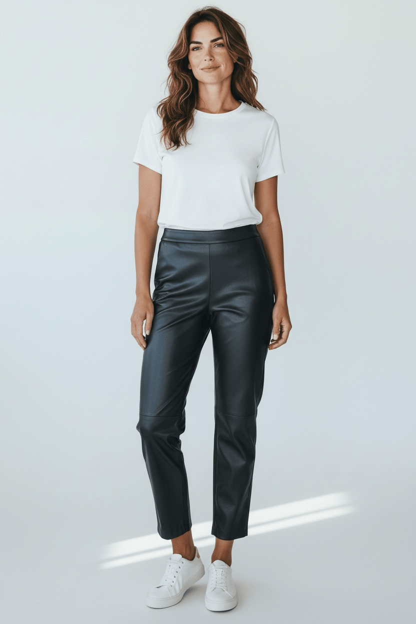 Crafted from premium vegan leather, these ankle pants feature a distinctive stepped hem design that creates visual interest and modern sophistication. The front hem sits slightly shorter than the back, offering a contemporary silhouette that works seamlessly with both minimalist and statement footwear. A refined choice for those seeking sustainable style without compromising on quality or design innovation.