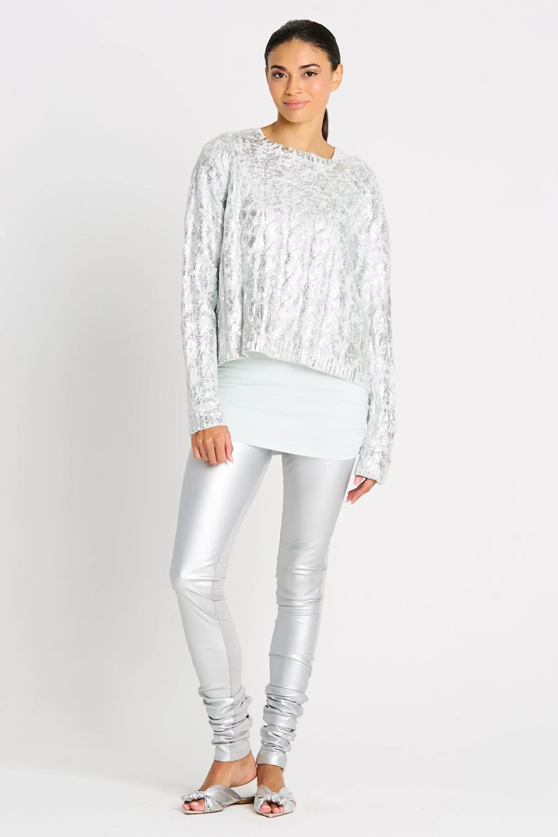 Add subtle shine to your knitwear rotation with this cable-knit crewneck sweater. Crafted from ultra-soft, breathable Pima cotton, it features a refined cable texture and a delicate metallic foil finish that catches the light for effortless polish. Lightweight and easy to layer, this modern silhouette pairs seamlessly with denim, tailored pants, or skirts—perfect for day-to-night wear.