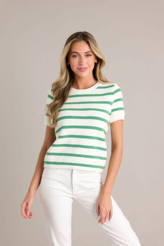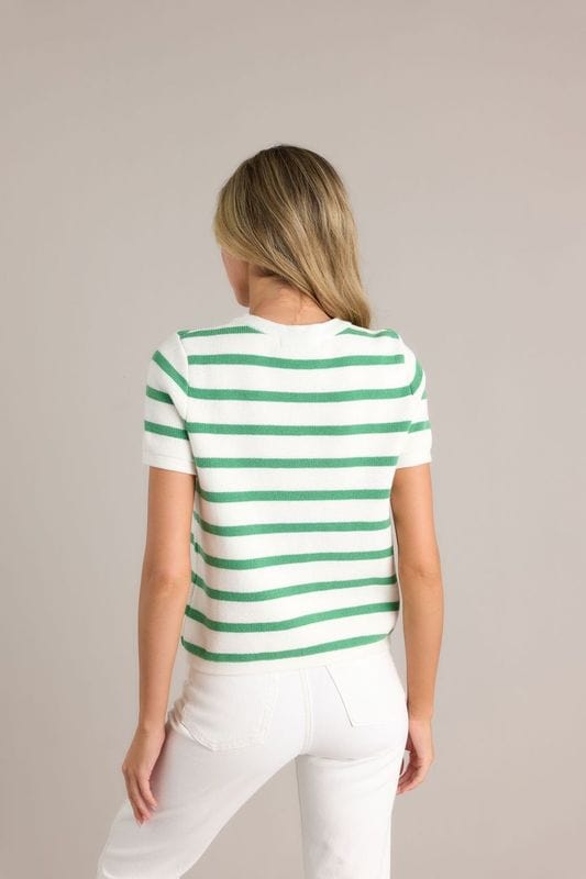 Add some fun to your wardrobe with the Prosperina Mary Lynn Sweater. This playful short sleeve sweater features a trendy striped design that will keep you stylish and comfortable all day long. A must-have for any fashion-forward individual.