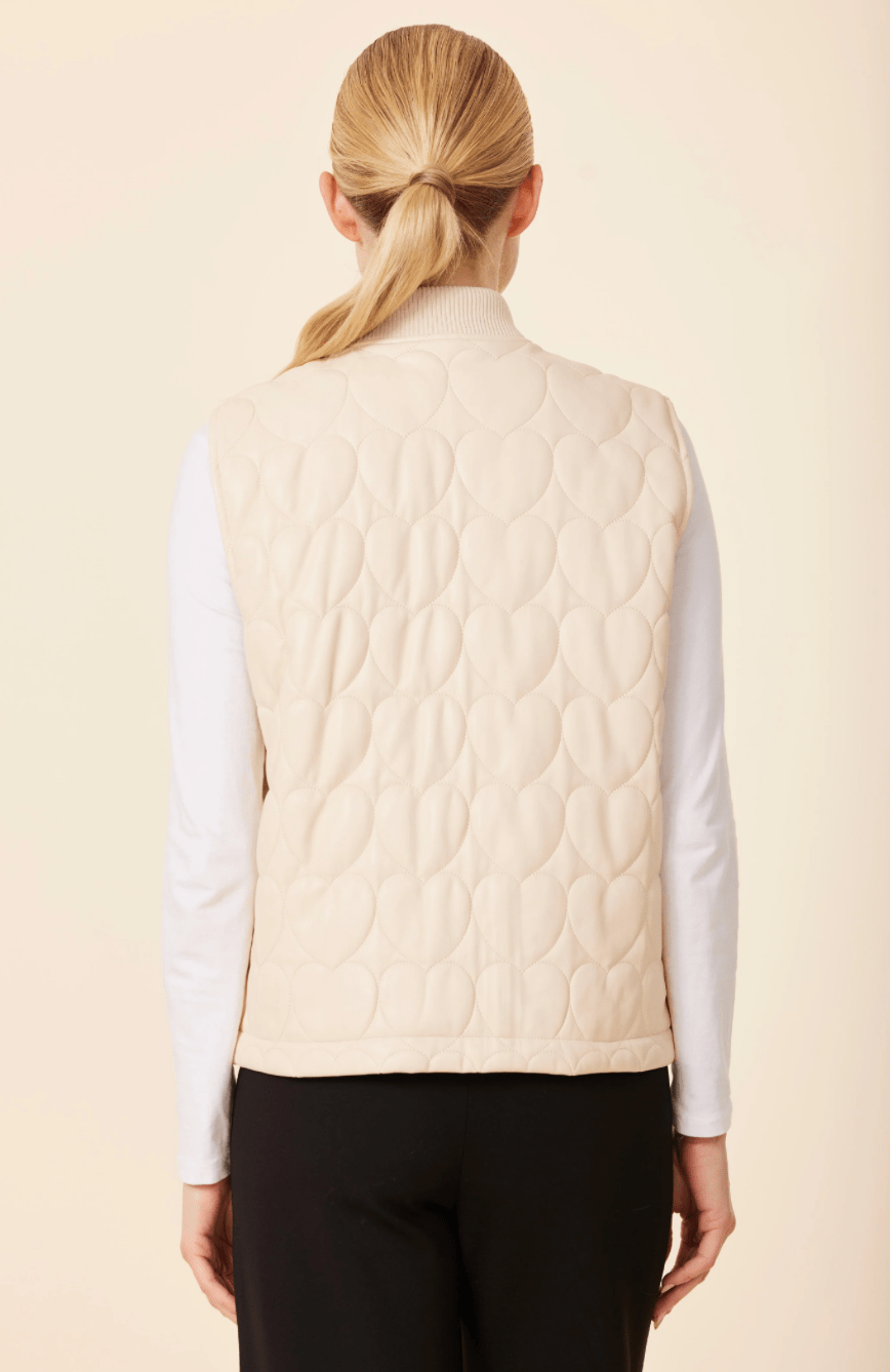 Stay stylish and cozy this Fall with the quilted faux leather vest, featuring a unique heart-shaped stitch pattern and a sleek zip-front closure. Designed with a ribbed collar and side pockets, this layering essential adds a touch of modern edge to women’s Fall fashion. Perfect over sweater or long-sleeve tops for a chic seasonal outfit.