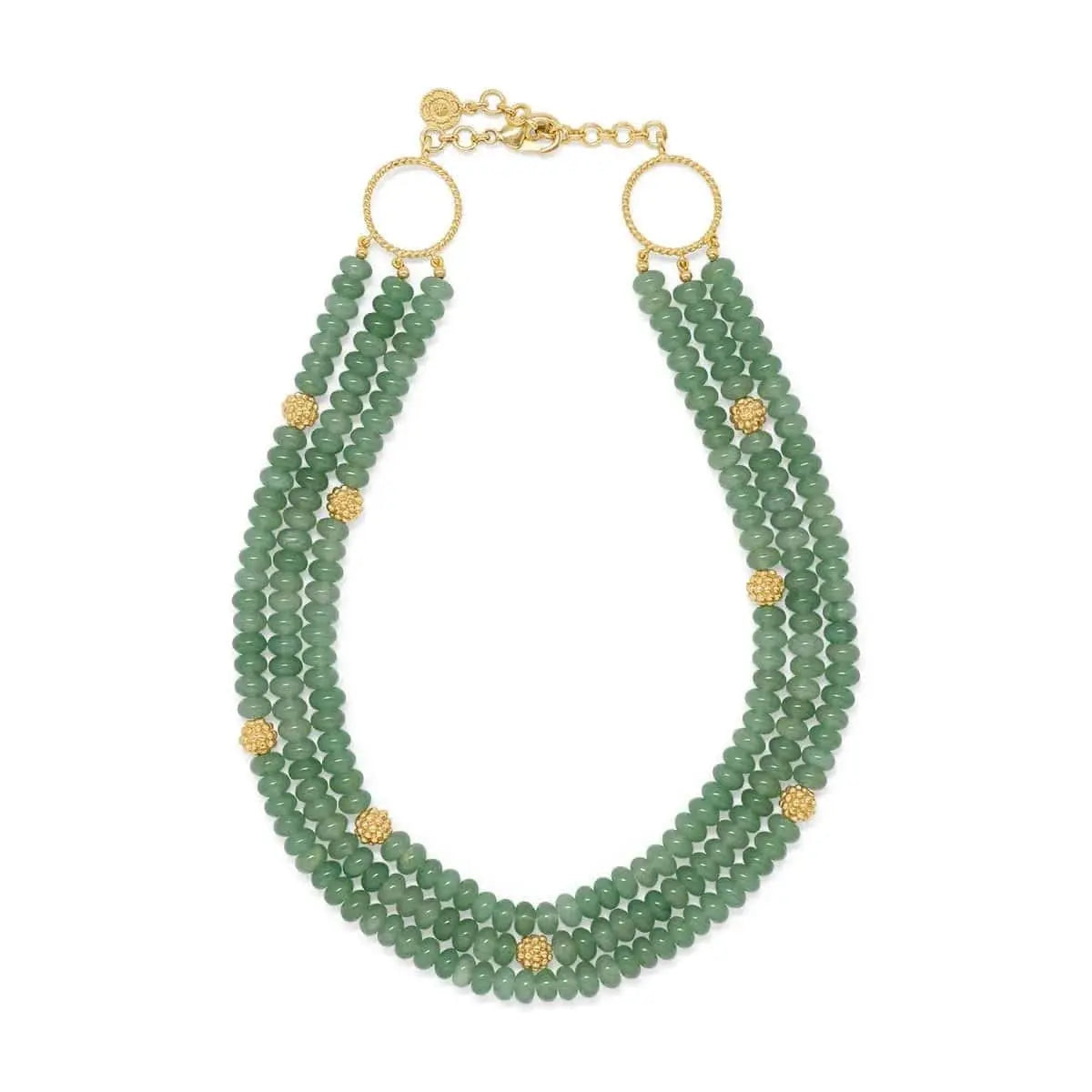 We love to live colorfully. Our triple strand necklace with richly saturated hues of jewel-toned jade beads, strung and polished like pearls and dotted with a sprinkling of golden berries. Simultaneously decadent yet earthy, this bewitching statement piece sings with any outfit, for any occasion.