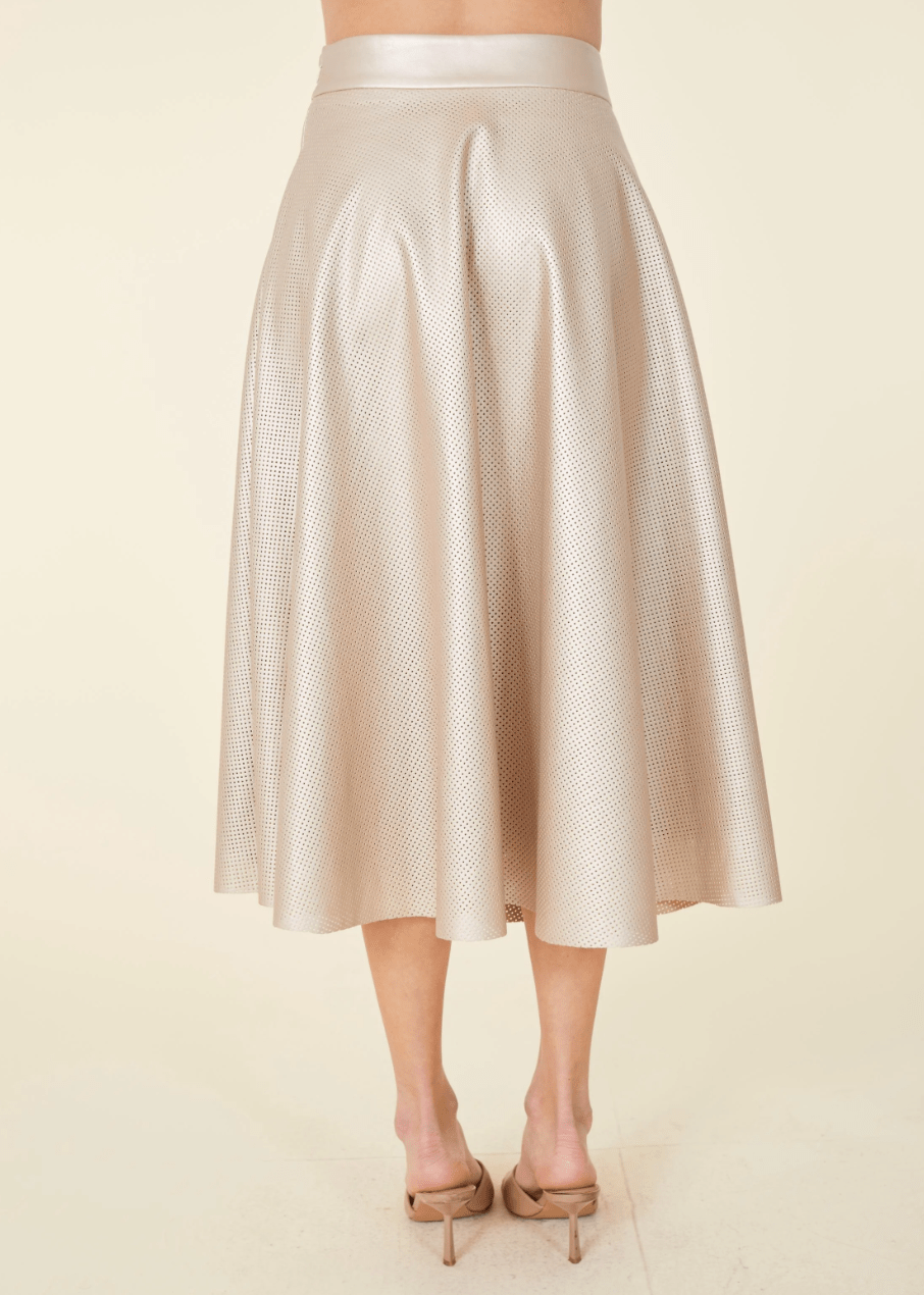 Stay on-trend with the Vegan Leather Perforated Skirt, a must-have piece. The versatile midi length and comfortable elastic waistband make it a practical and stylish option for day-to-night wear. The intricate perforated texture adds a modern twist to the classic faux leather material. The midi length and large pleats create a flattering silhouette for all body types. Available in a stunning metallic sheen in the Pale Gold variant, this skirt is a versatile and stylish option for any occasion.