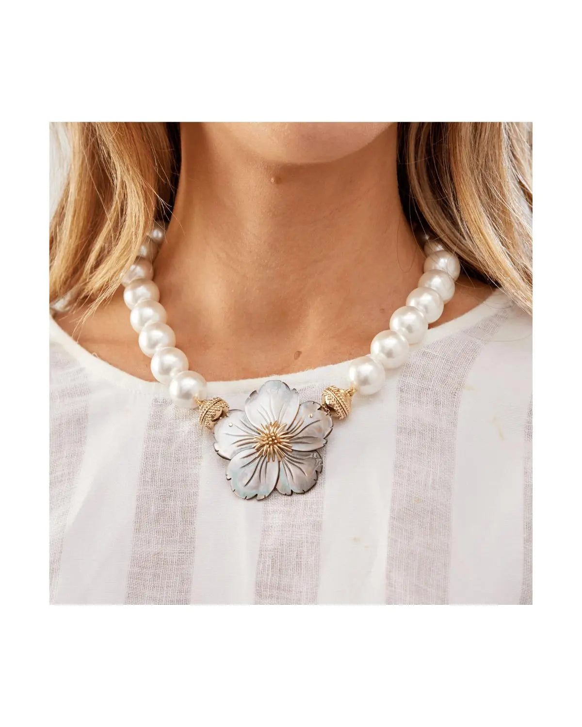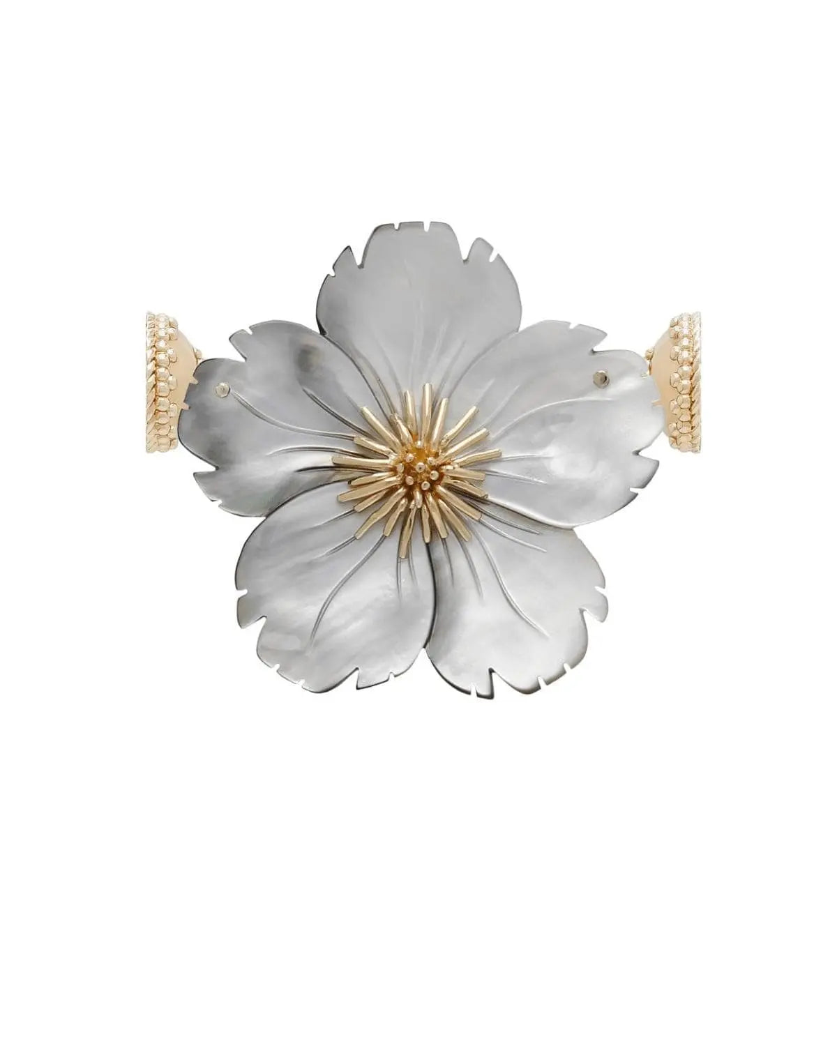 Refine any look with this carved mother of pearl flower and its 14k gold accents.
